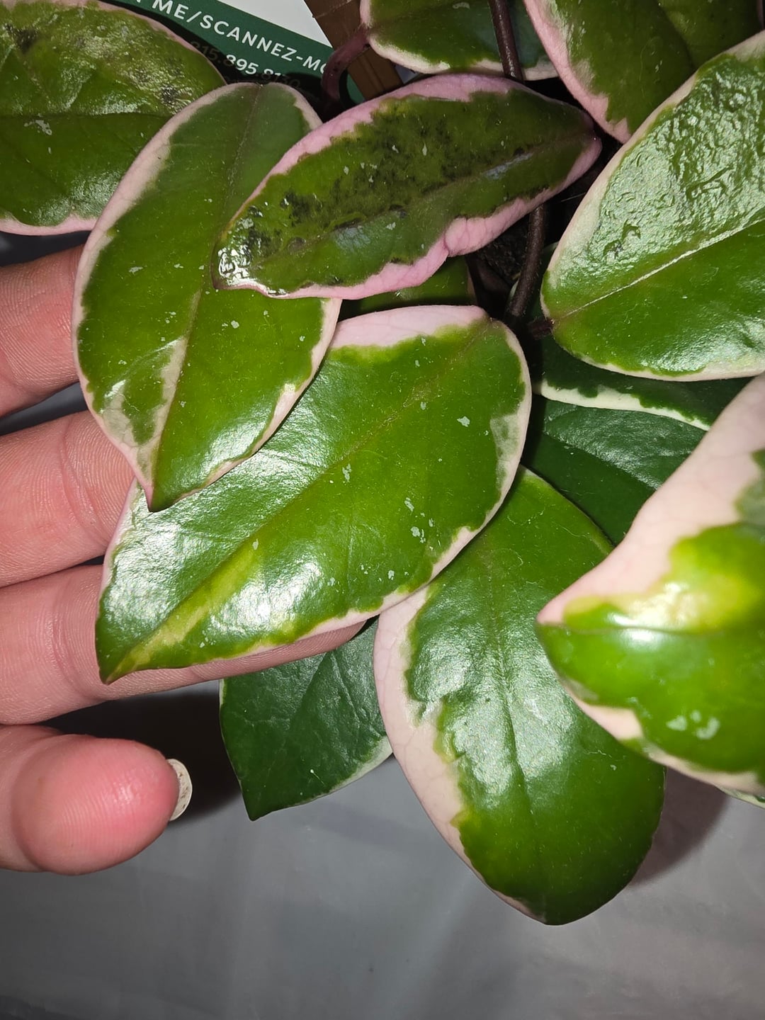 I found this Hoya at the local hardware store. The tag says it is a new type called Hoya Shining Sea Star. Does anyone know anything about it? I love the pink color on the edges and I also see small white speckled variegation on some of the leaves. She is still in quarantine as I have only had her for about a week. Two of her leaves look like they may have something going on.