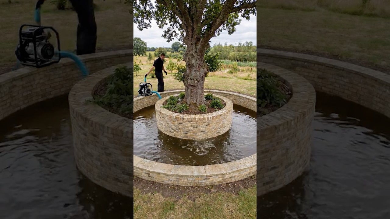 Stupid. Never excavate under a tree canopy! It kills the tree! The smallest roots that take up water are under the perimeter of the tree canopy, called the drip line, where water drips off the leaves. If you cut out those roots, the tree can't uptake water, and it dies! Only excavate at least 5 – 10' beyond the drip line. For redwoods, much further. . As shown in this video, this will leave a dead tree stump surrounded by a pond.