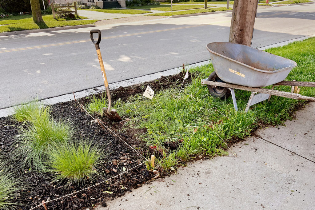 Digger’s Hotline checked the infrastructure and left flags to okay grass removal. I planted my low-growing prairie dropseed into lines as “cues to care” for neighbors skeptical of the bold move. The plants are charming and well-behaved and thus don’t lower anyone’s property value, which is often cited as the biggest obstacle to native plants. I don’t have to mow my park strip; the prairie dropseed survives the street schmutz and snow piles; and their brown wands wave the birds over to feed. Everybody wins.