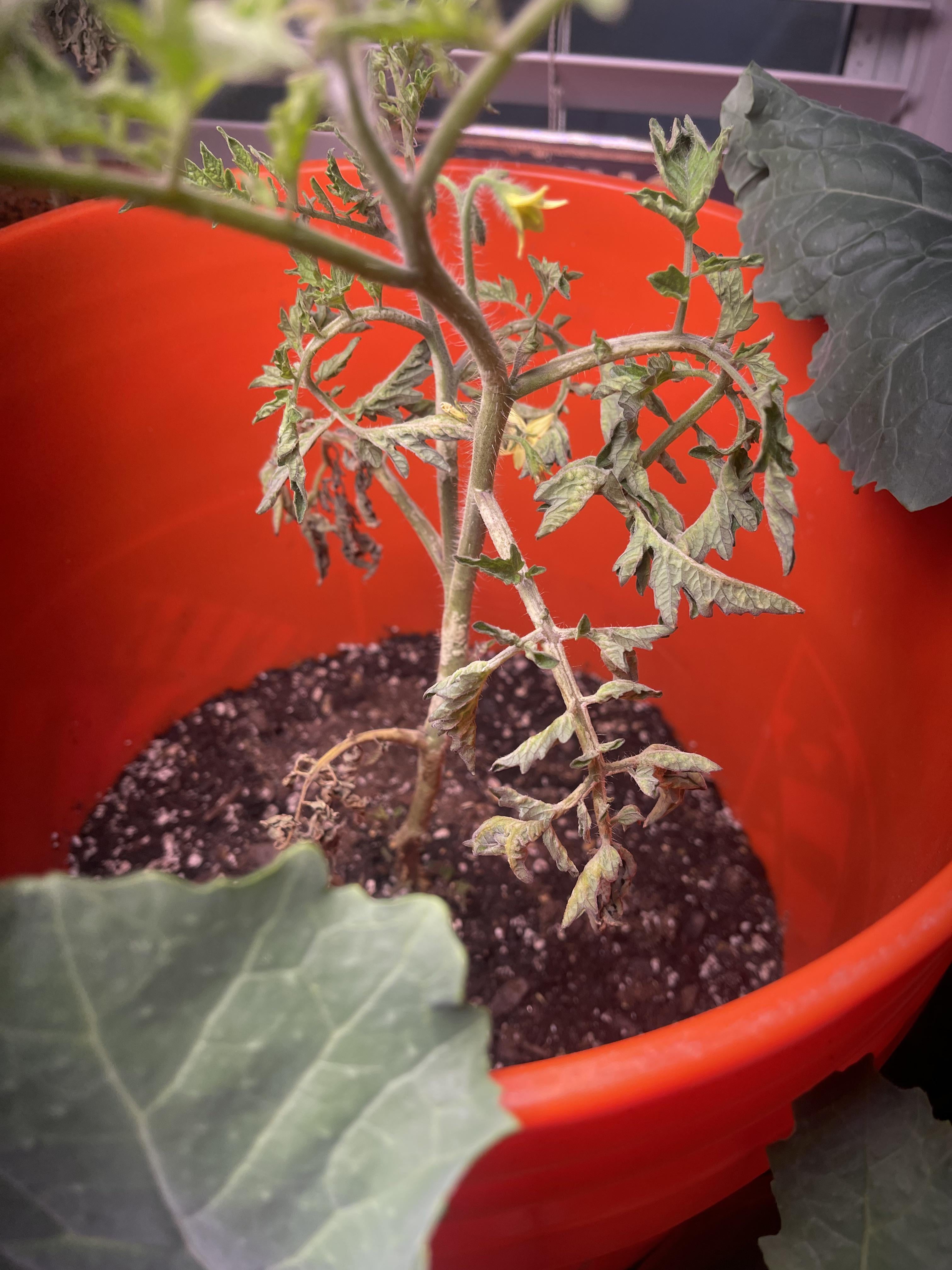 ennemmjay 1 week ago It may or may not be causing your issue, but that pot is way too small for a tomato plant and seems to be under filled with soil.