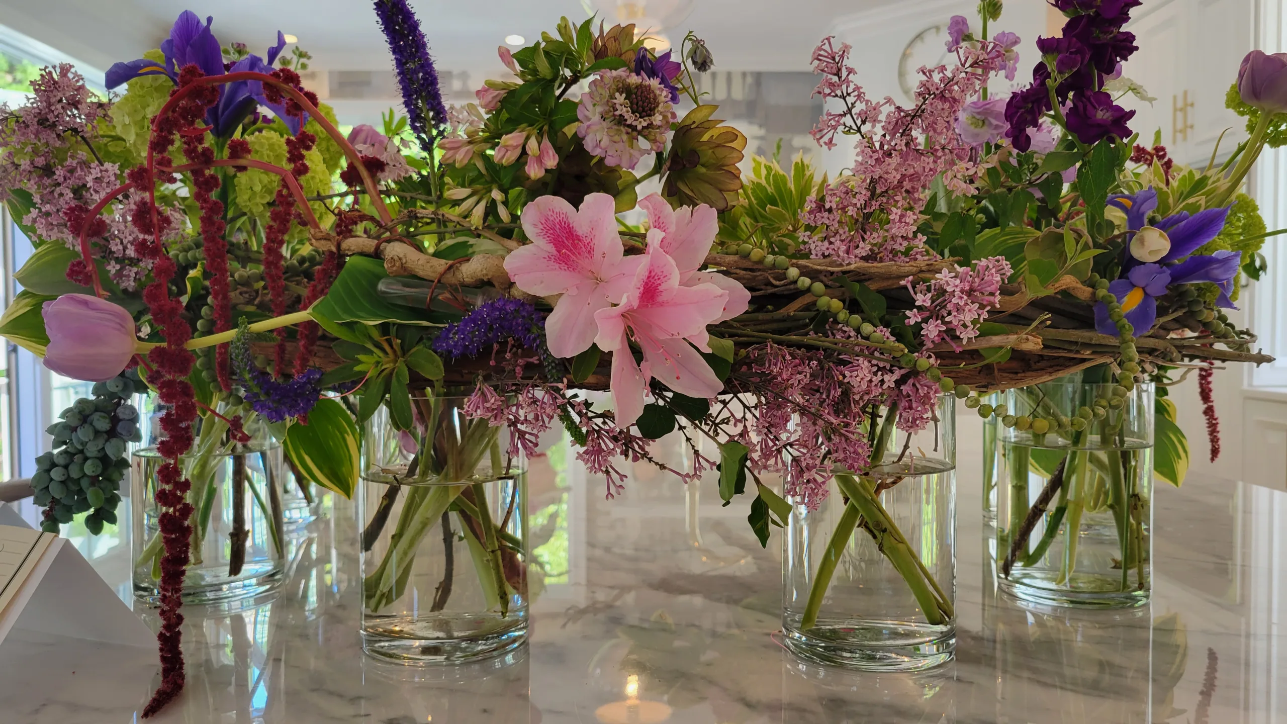 A cleverly constructed woven twig bridge connects glass cylinders with lilac, azalea, hellebores, hosta, hanging amaranthus, and viburnum.