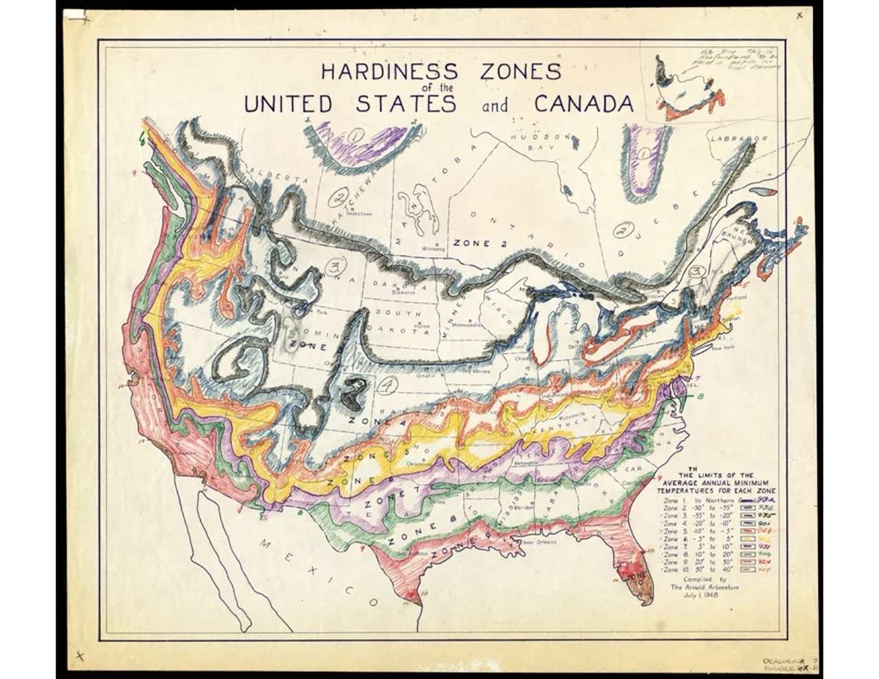 The first USDA Plant Hardiness Zone Map was published 98 years ago by researchers at the Arnold Arboretum, in Boston. (By the way, the Arboretum, with its wonderful collection of woody plants from temperate zones around the world, is free and open every day.)