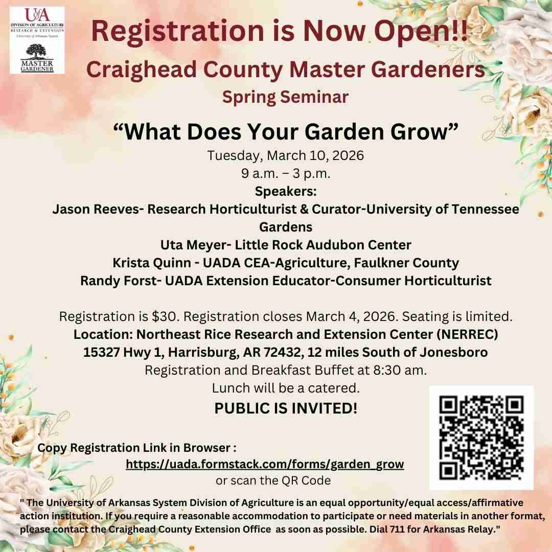 EASTERN ARKANSAS — Today (Wednesday) is the last day to register for the Craighead County Master Gardeners’ spring seminar “What Does Your Garden Grow.”