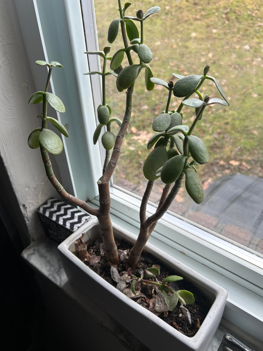 I believe this is a jade tree and I’m not sure how to help make it healthy. I have been watering it very little because I’m scared to over water it. I’m not sure of normal water habits I heard it’s sparingly but I wasn’t sure if that should change to help revive it. I just got recently and decided to put it on this window to get sunlight. I have kept it there without moving it so far. I have no idea what type of soil is there but I figured I need to repot this with new soil so suggestions for that would be greatly too! Literally any advice to help would be awesome!!
