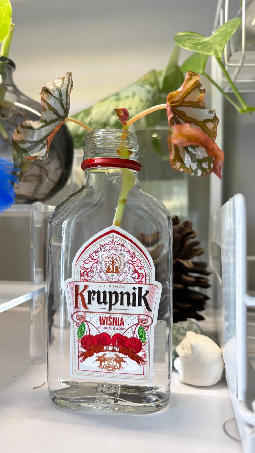That’s super cool! But a word of warning…if you leave them in there too long due to the clear glass you will have issues of algae formation on the developing root systems…I use old bottles as well…but I stick to he coloured beer bottle glass like brown, blue and green…you can see the roots forming but the algae can’t grow on them…and it looks kinda nice…