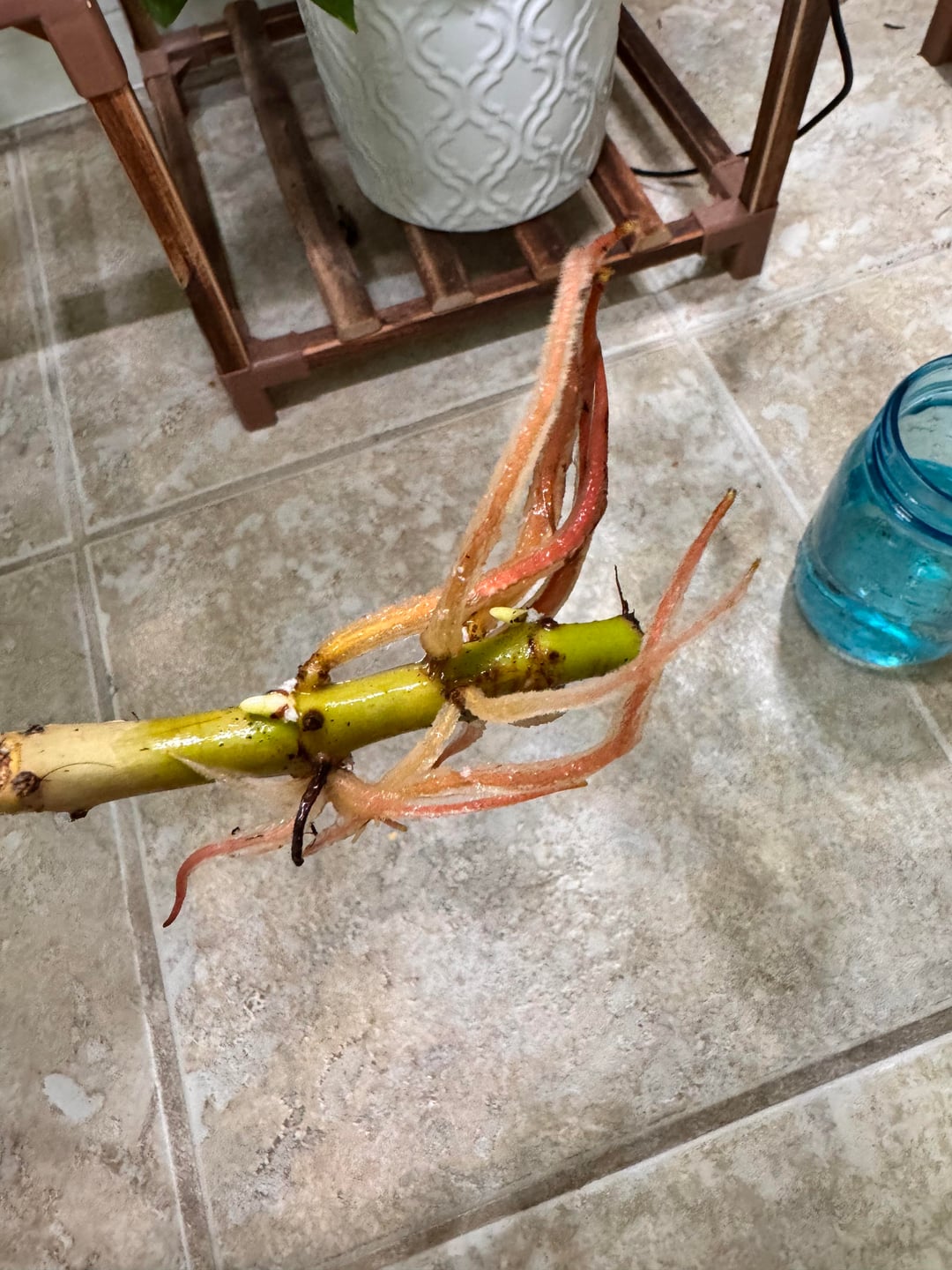 One has strange looking fuzzy roots and the other little spiky roots.