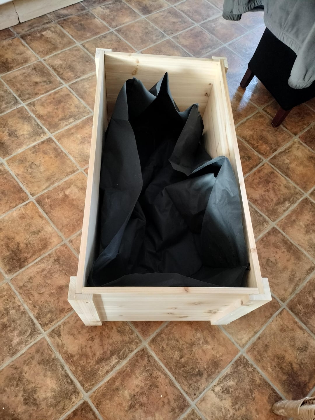 If there’s no holes in the bottom, you definitely want to put some for drainage because roots need oxygen and will drown if submerged in water. This appears to be untreated wood so I imagine the box is going to rot out sooner than later so keep that in mind too.