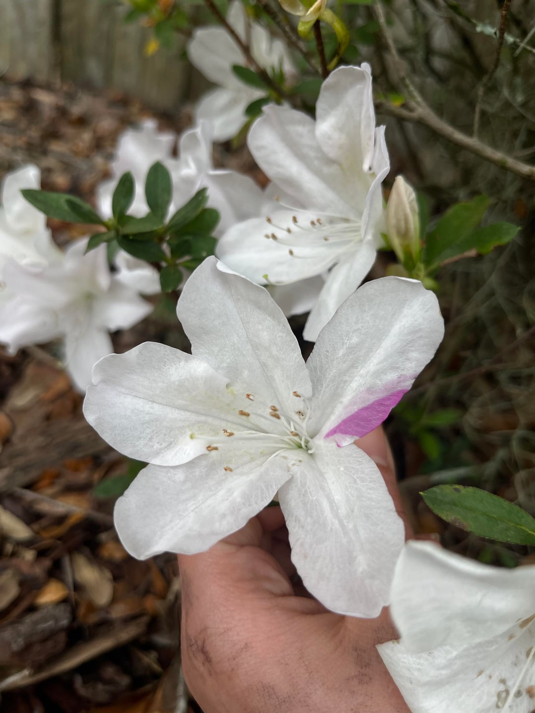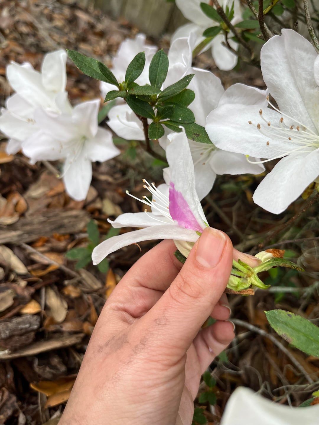 I have noticed this flower on one of the Azalea plants growing in my family’s backyard. There are other flowers like this one (white with a pink stripe on one petal), but this was the easiest one to photograph. What exactly causes this? Is it possible that these flowers are results of mutations? Or is it an example of co-dominance where both pink and white petals are present? Your help is much appreciated.