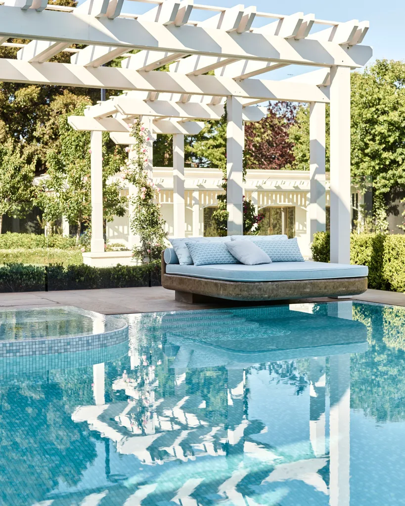 To strengthen this, sitting over the edge of the pool is a custom lounger in Jim Thompson ‘Palm Plain’ and ‘Fez’ fabrics from Milgate, creating a luxurious way for the homeowners to languor by the pool.