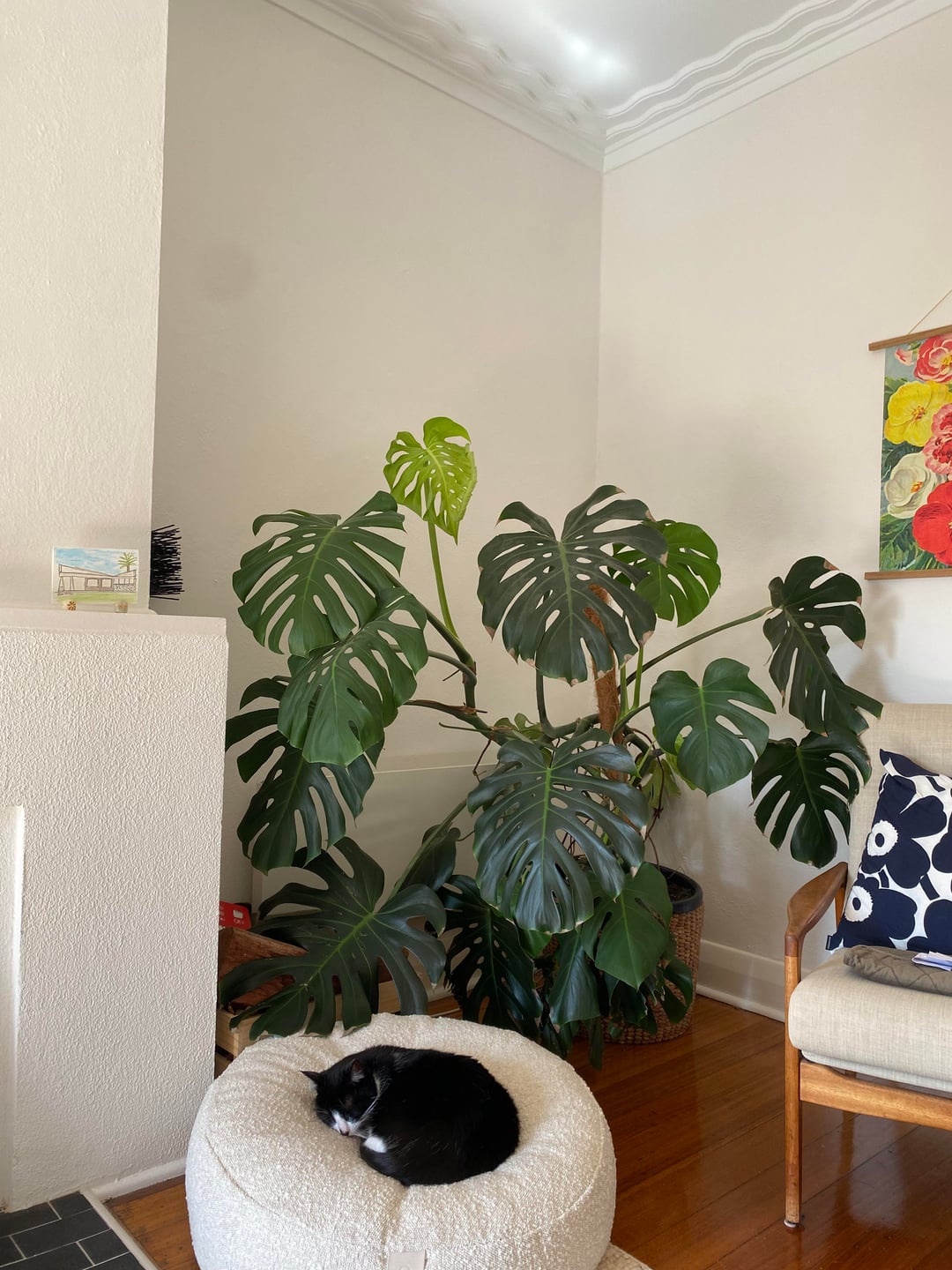 I recently repotted it and tried to anchor a moss pole deep in the roots, but it’s already starting to lean from the weight.