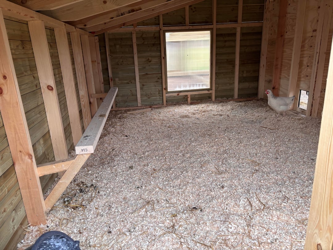 The the footprint of the whole thing is around 6×10 meter (20x32ft), and the coop itself is 3x4m or 12m2 (9x13ft). Still needs paint, and a bit of finish work. I also need to build the interior, but so far the new girls prefer sleeping in a pile in the corner, and it's gonna be a few weeks before they start laying.