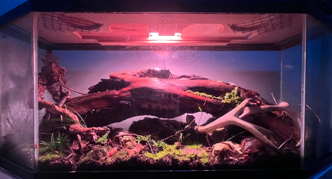 This terrarium was created in November of 2024 (I know it’s not nearly four years it just sounded more grand lol) I don’t know all of the plants I have in there I’ve tried image searching but nothing matches exactly. The light source as you can see is an led light bulb. I use a hand held air pressurized water sprayer to water the tank daily with tap water( we are well fed so there’s no big danger of using the facet and the plants seem to love it). The substrate is a mix of coco fiber as well as soil from the my yard. It’s a 55 gallon tank.