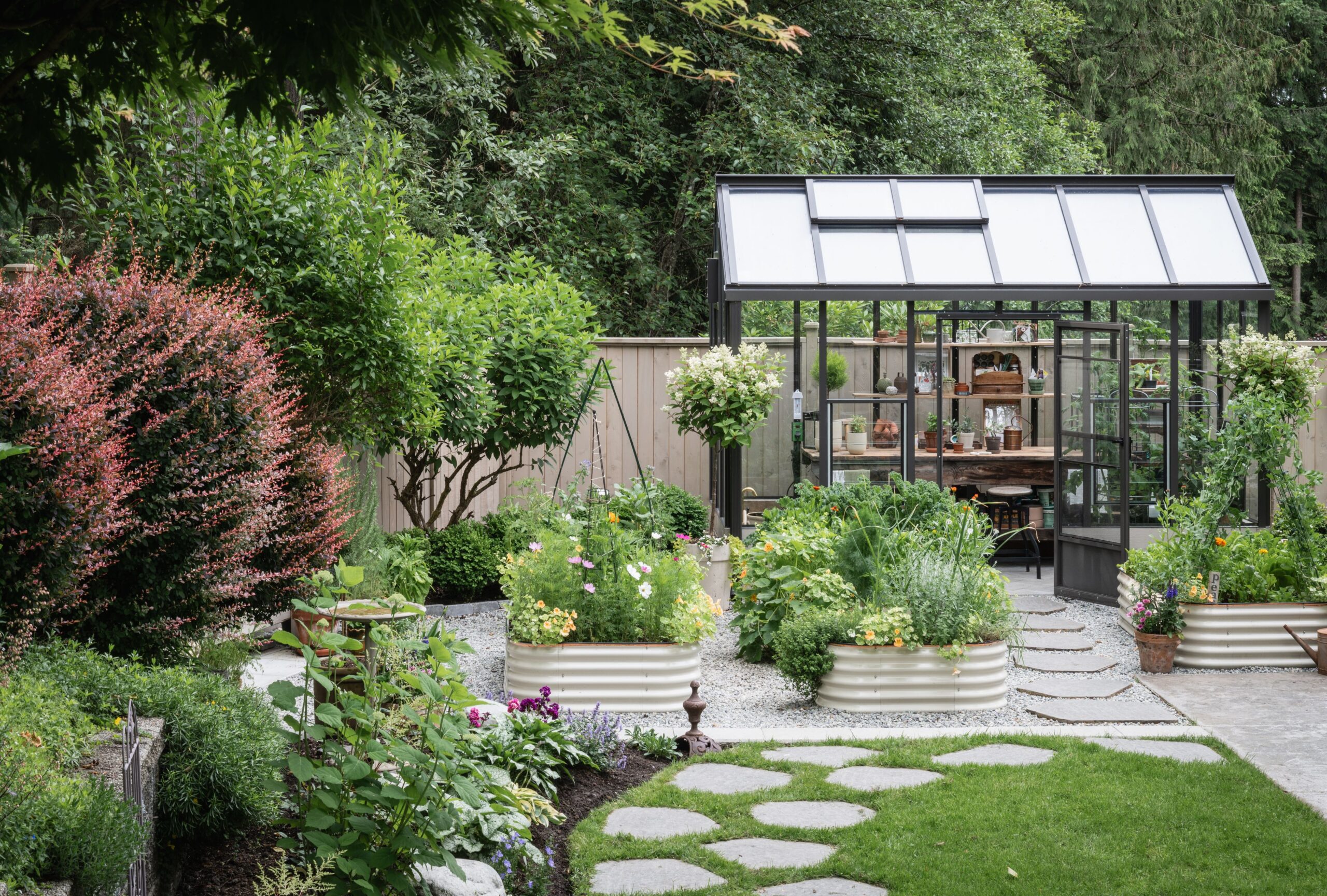 A greenhouse by BC Greenhouse Builders was custom-built to fit within the limited footprint in the back of the garden. Outfitted with water and electricity, the space allows her to get a jump on the growing season; she starts 90% of her crops from seed there, including sugar snap peas, kale, and calendula. “I love to crank the heat and work while it’s pouring rain outside,” she says. “It’s a total escape.”