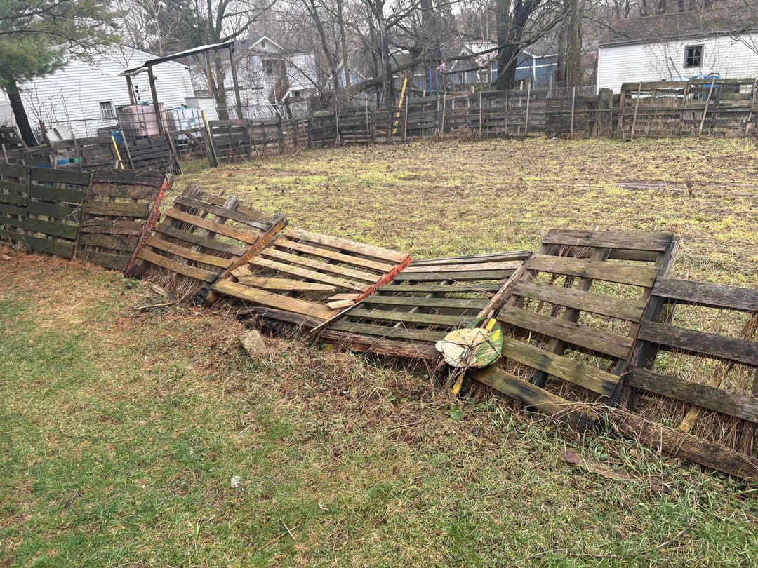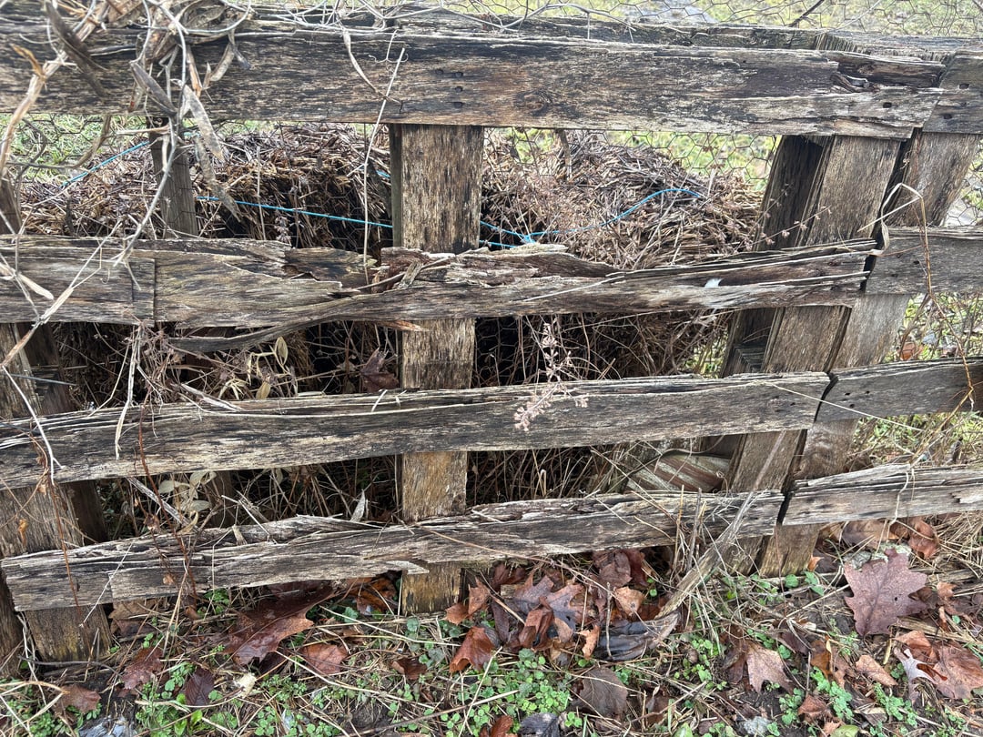 Do a similar set up as it is currently. Metal stakes with chicken wire around the circumference and use free or cheap pallets to make the outside look nicer. I am concerned about how to stabilize the pallets so they don’t eventually fall over themselves from rotting support like in the photos. I’m worried about this being a fence that would need to be repaired every 2-3 years and looking a bit dingy after some weathering. I would try to match pellets or take them apart and reassemble them to be more consistent and nicer looking.