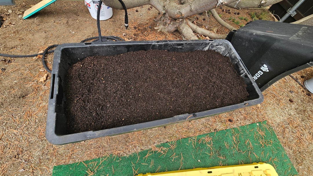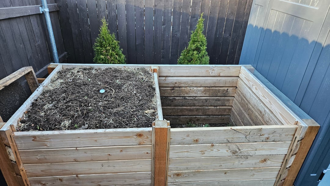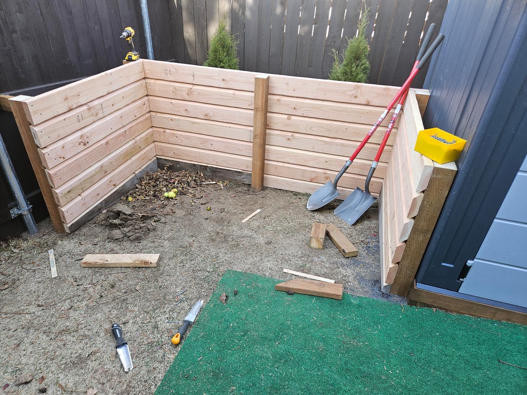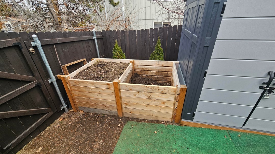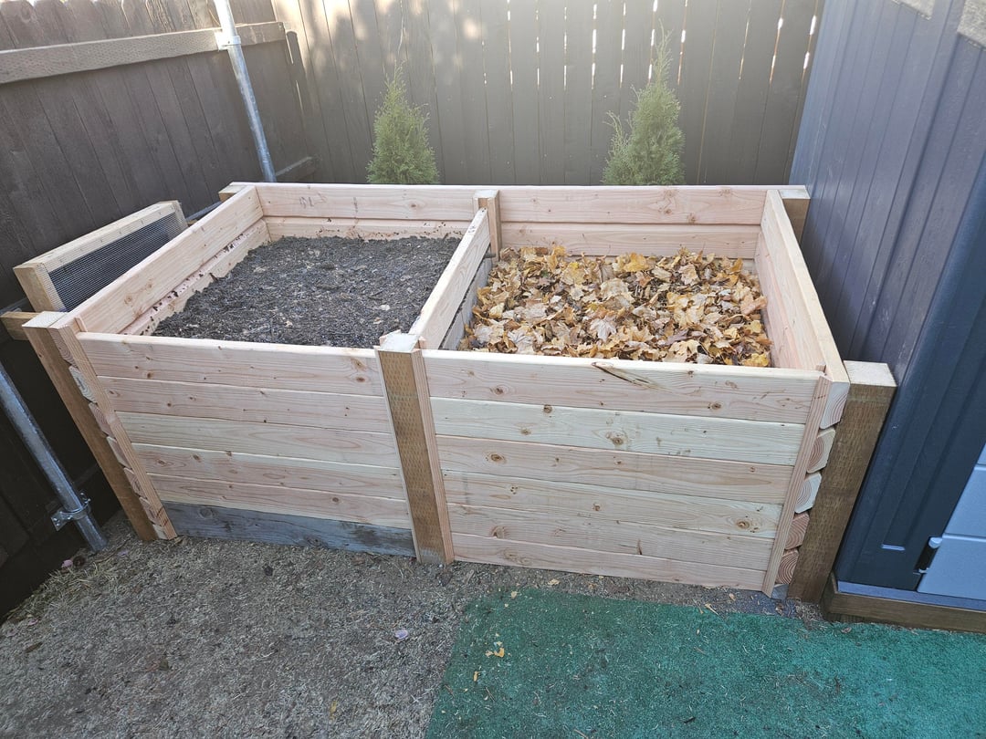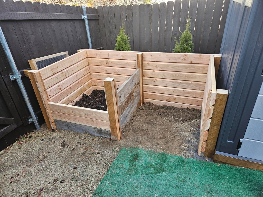 Built out of scrap 4x4s from the shed base and box store 2×6 studs, which were under $5 at the time. Ripped a bevel on each 2x to allow for ventilation while keeping material contained. The front and middle slats can all be removed as needed to turn the pile.