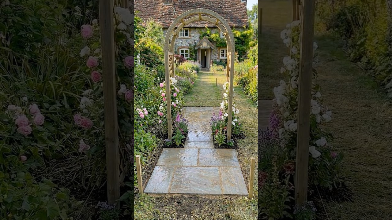 cottage flower arch walkway, flower arch garden path, cottage garden walkway, romantic garden pathway, climbing flower arch design, garden arch walkway, front yard landscaping ideas, garden transformation, diy garden walkway build, residential garden makeover, satisfying garden build, landscape pathway design, cottage style landscaping, reels garden transformation