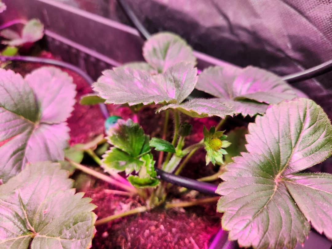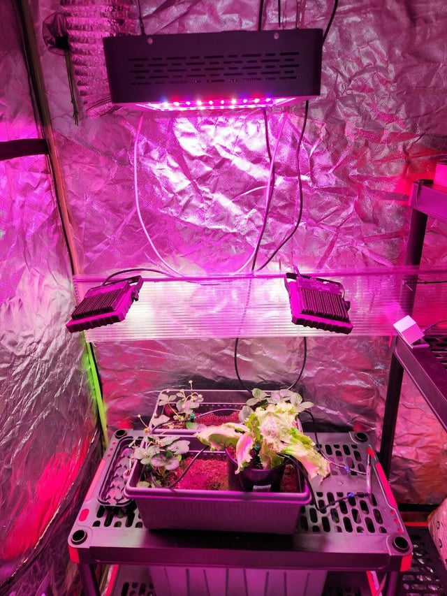 IMO the strawberry stems look a little long and stressed so I've just lowered the grow light from about 90cm to about 55cm above the plants as well as adding a couple of white lights for some extra output. Hoping that has them looking better.