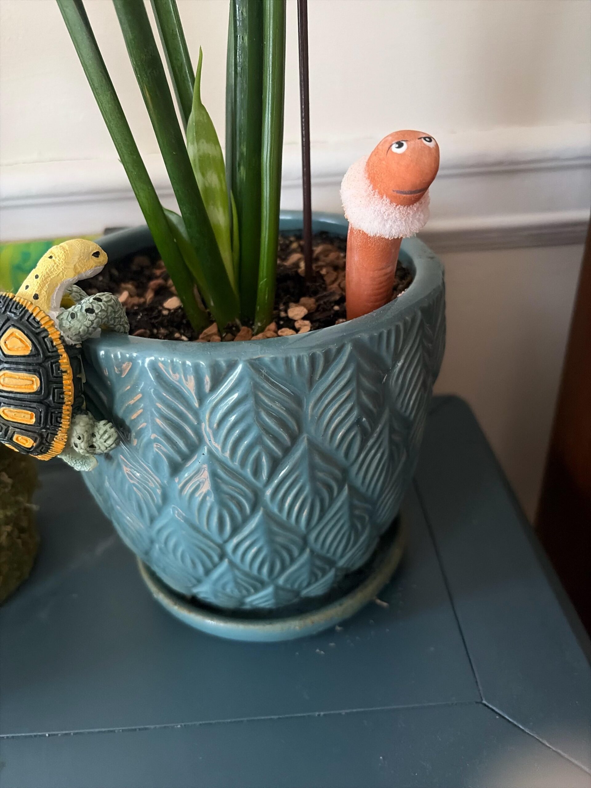 Hey, haha, I have one of those! It’s actually not decorative, he’s a moisture reader. The clay he’s made indicates the wetness of your soil; you pull him out to see if you need to water by the color of his tail!