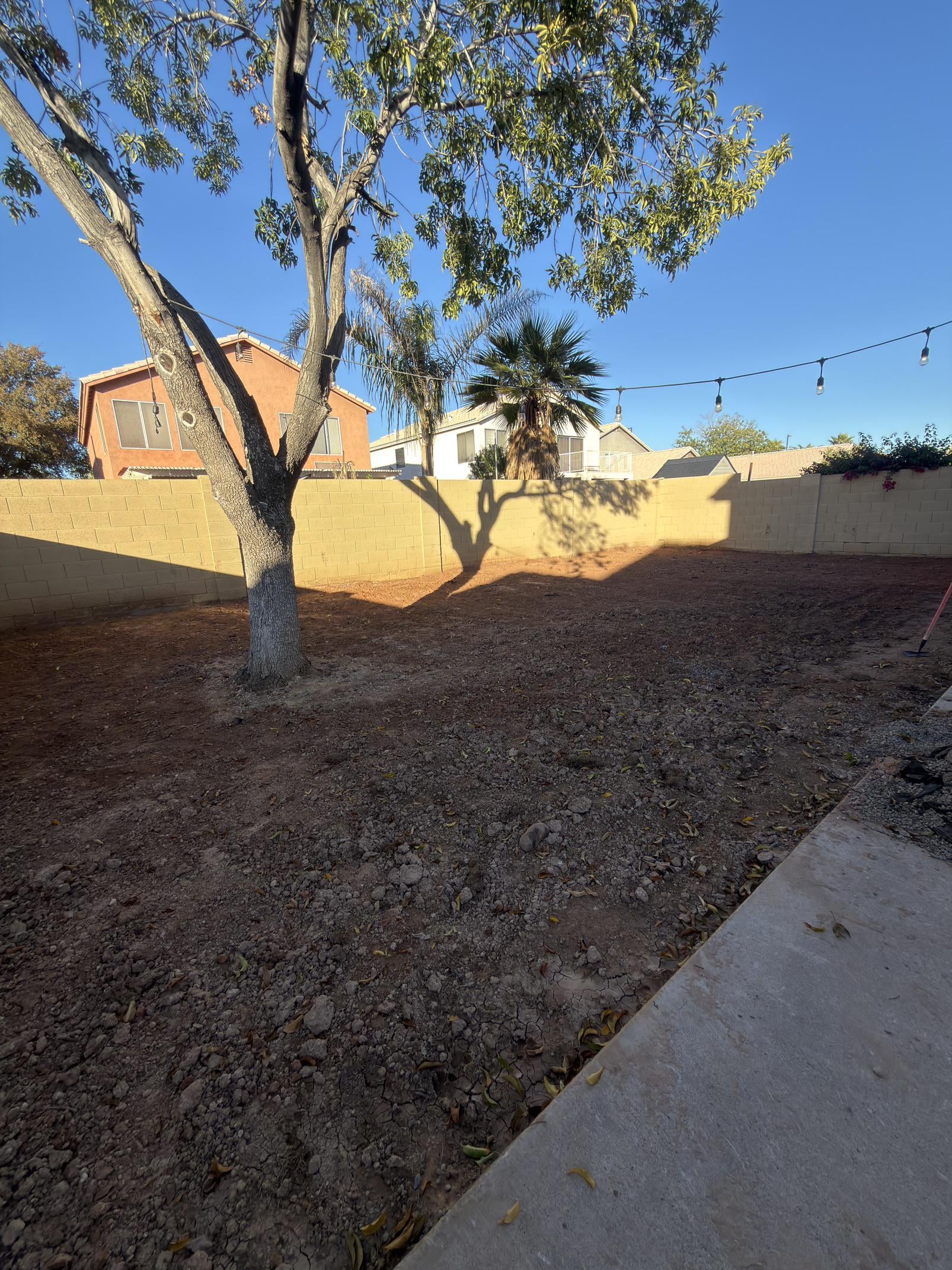 Looking to get some ideas on my backyard and what I should do with it. This used to be all rock bordered with a retaining wall in the back and a massive ash tree stump. Had someone come remove all the rock and now I’m trying to decide if it is better to throw down turf or lay down sod. There is a sprinkler system already installed but I’m not sure of the state it’s in since the backflow valve is leaking and the system has been off for years. There are a few sprinkler heads that are broken and were found during the rock removal. I’m not really looking to spend a ton to get this looking good and useable for my 2yr old. I do have a dog who currently uses the backyard but that could be managed. Measurements are 30ft from patio to block wall and 55ft from block wall to block wall (length). There’s some dirt on the sides of the house but I have plans for that (storage shed setup).