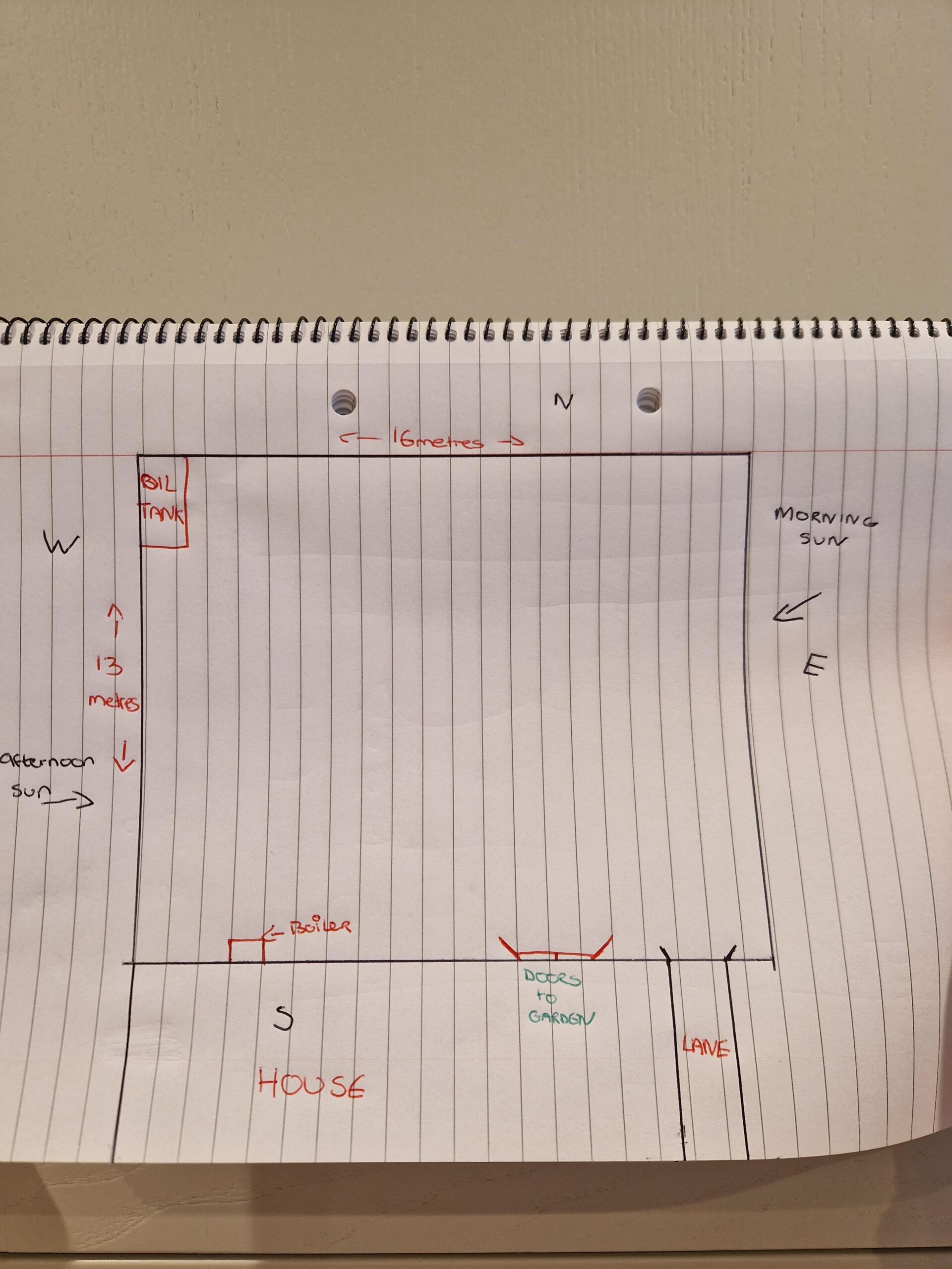 Garden is 13metre deep x 16metres wide. Orientation north/north west so morning sun on the upper right, travelling in front of the house and appearing as afternoon sun on the lower left and then bathing the garden until it sets.