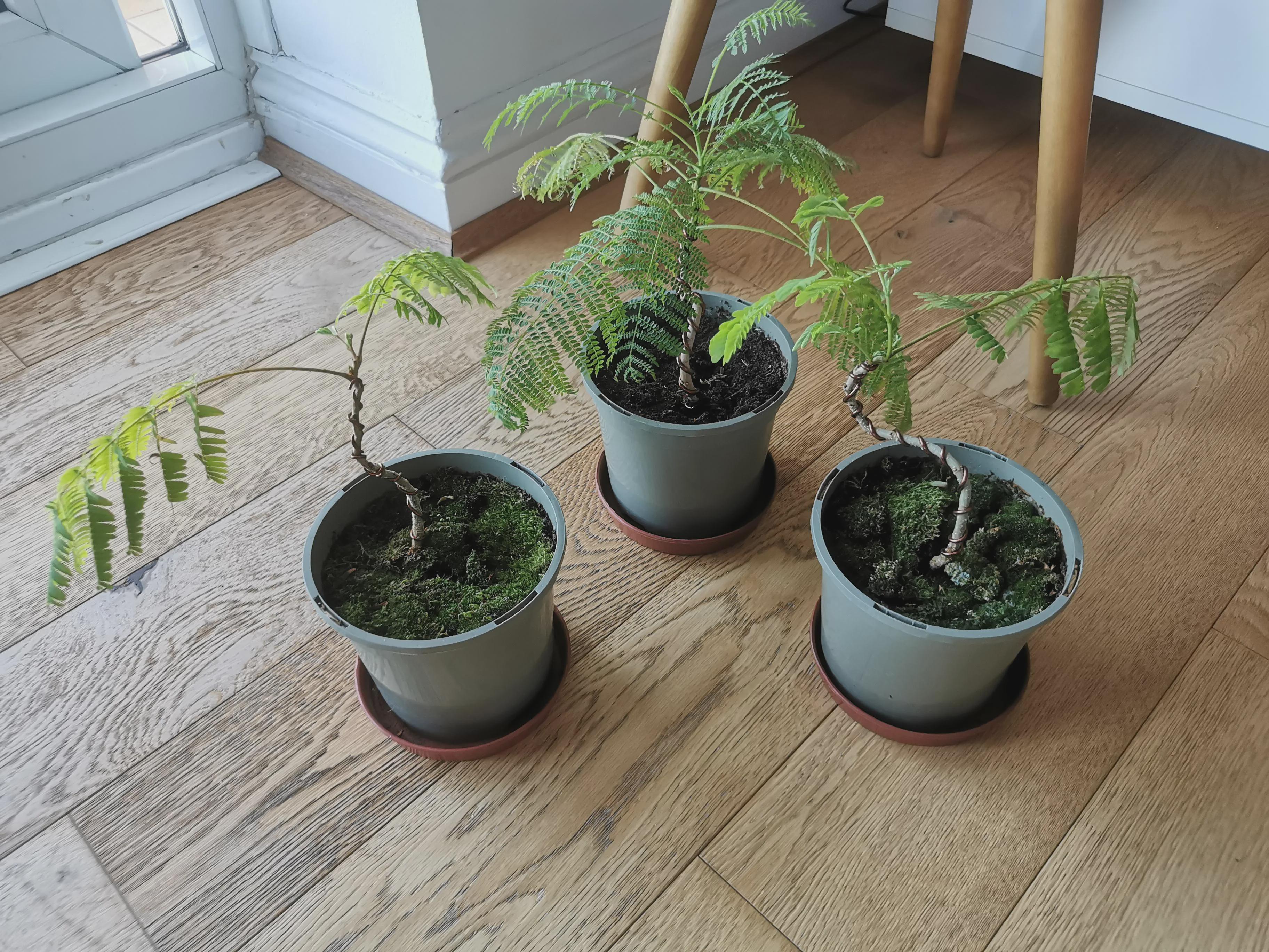 I have grown these two silk mimosas and jacaranda from seeds, they are roughly a year old now, they have survived their first winter nicely and they started growing a lot again so now I have some questions on what to do next as I want to keep them around this size but with a thicker trunk:
