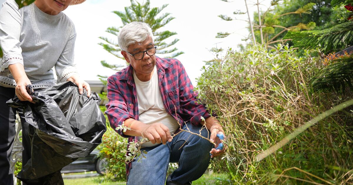 Senior couple gardening together trimming plants in home garden, Elderly Asian couple doing yard work and plant care outdoors, Active aging lifestyle