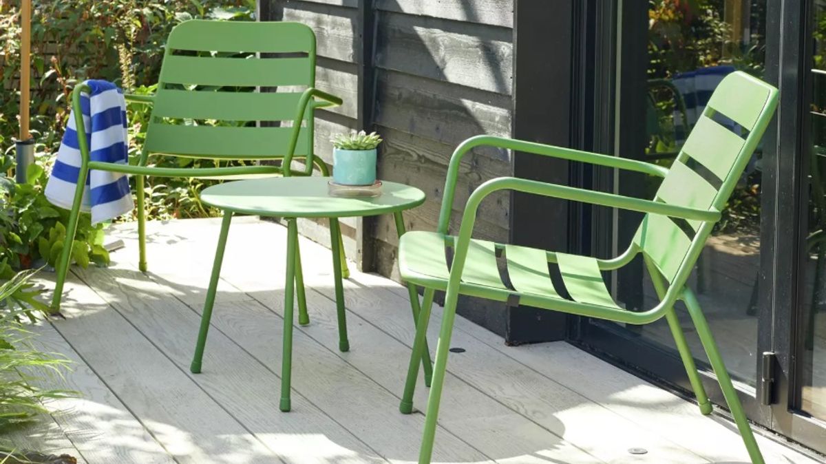The green garden set includes two chairs and a table, perfect for smaller gardens.
