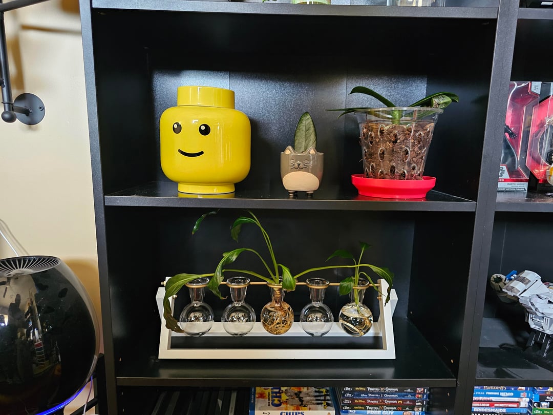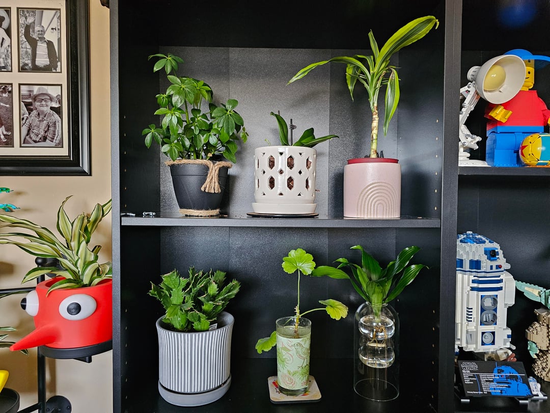 Previously shelves of baubles and collectibles, I made space to bring life into the office area. Plus, too many of these had collected on the kitchen counter (near a bright window) and my husband finally asked when we'd get that space back. 😂