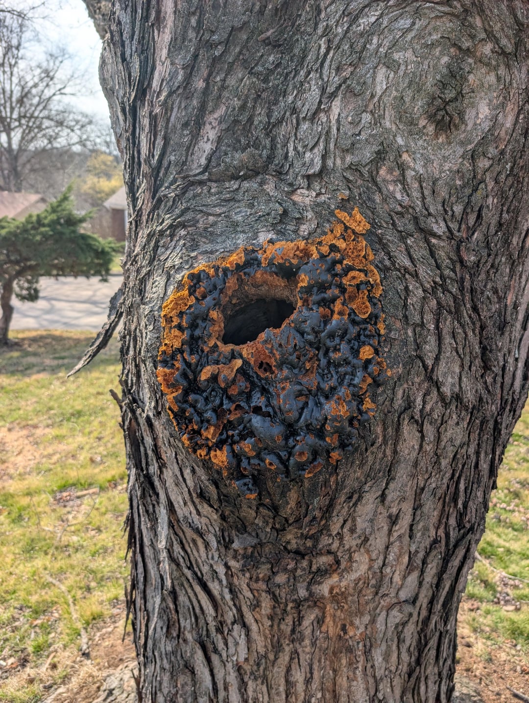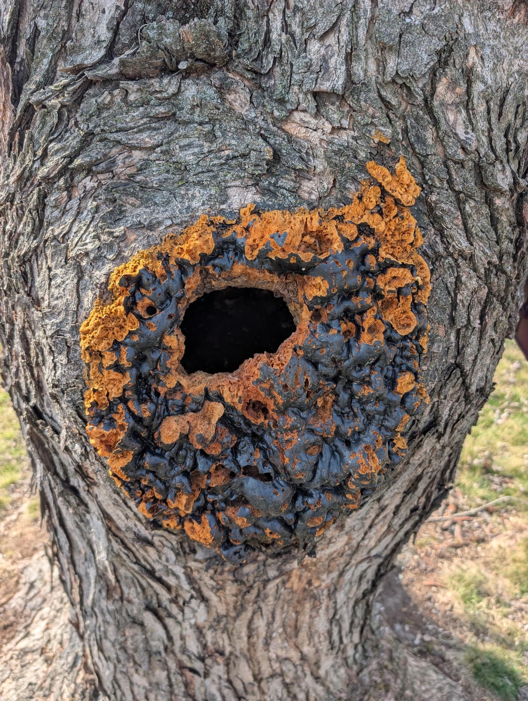 Arborists will fill in large gaps on trees with foam and then torch it in the surface to blend in the color a little. Usually it means they had to take out like a wasp nest or something that was in the trunk and you don’t want to leave a huge hole. This is probably an old one and the foam erodes away.