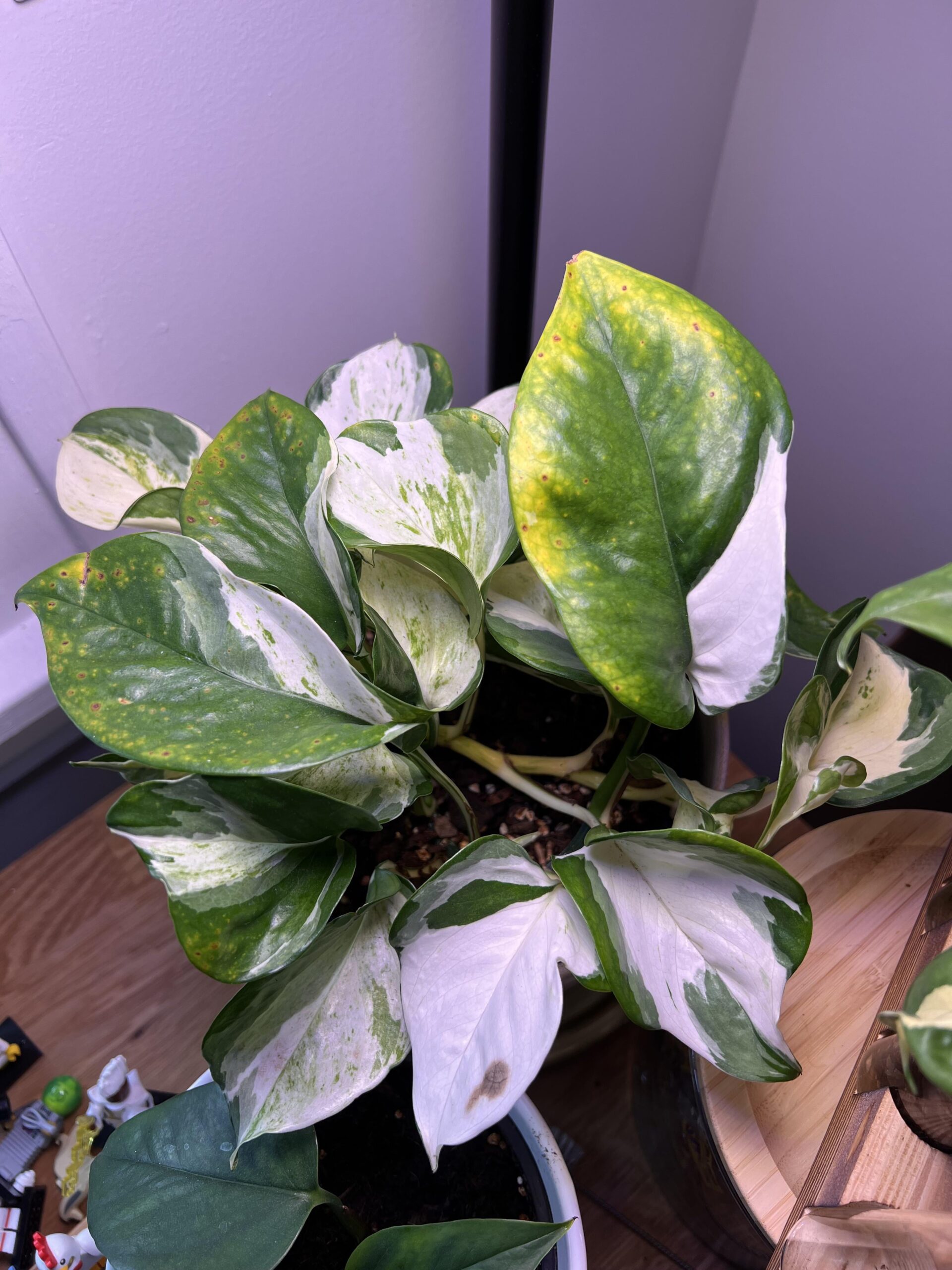 Larger leaves had developed brown spots along the outer edges with the larger one starting to turn yellow. ChatGPT is saying they have magnesium / nitrogen stress, not sure how as I’ve been using osmacote slow release. Looking for any advice on dealing with this as manjula leaves seem to yellow and brown regularly.