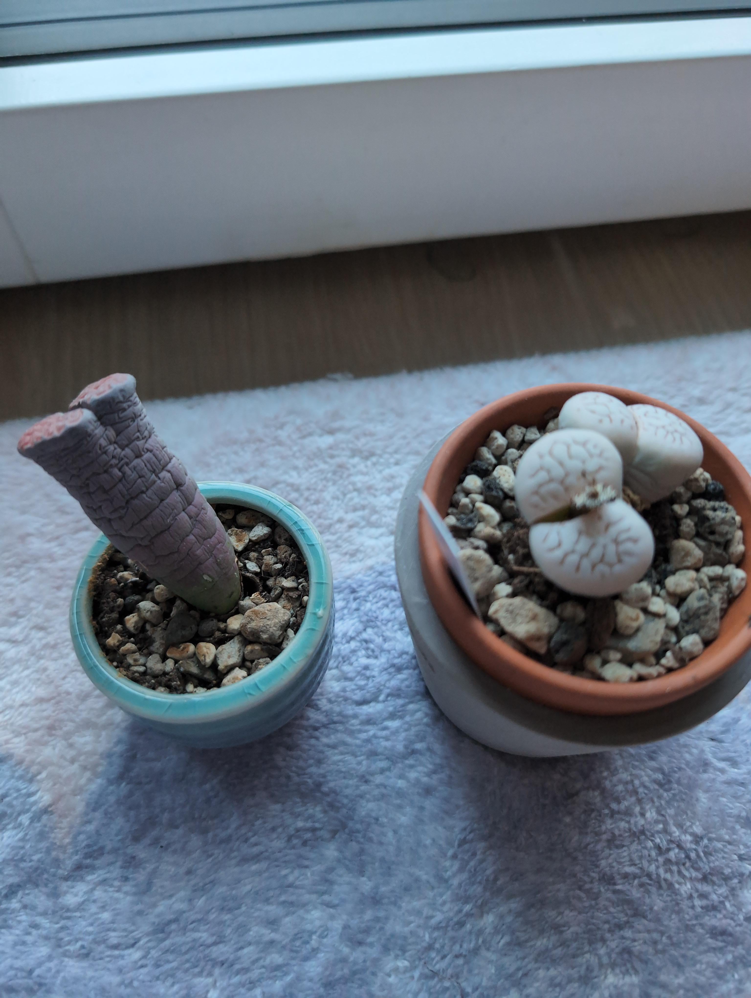 First time buying lithops (I know the right one isn't exactly Lithops). I completely messed with the lighting and watering this whole year. It is spring and they are not splitting. What should I do? Water? Fertilize? I've already put them under a good grow light