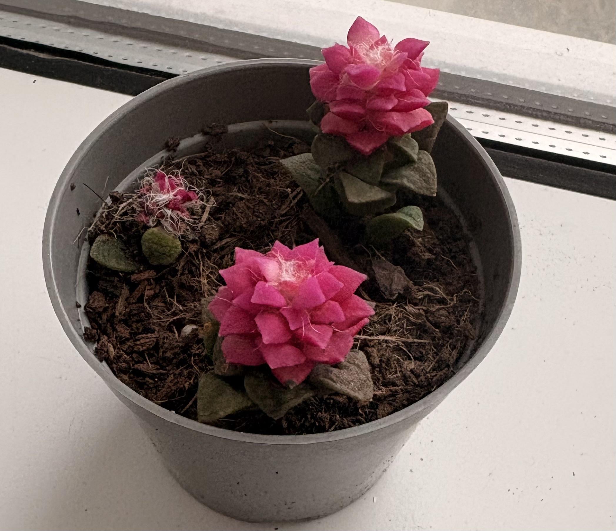 Howdy. As the title says, this was a gift. The soil was pretty moist when I got it mid-February, so I’ve only watered it once so far. Could someone ID this please? Also, what are the hair-like thingamajigs? I appreciate any assistance.