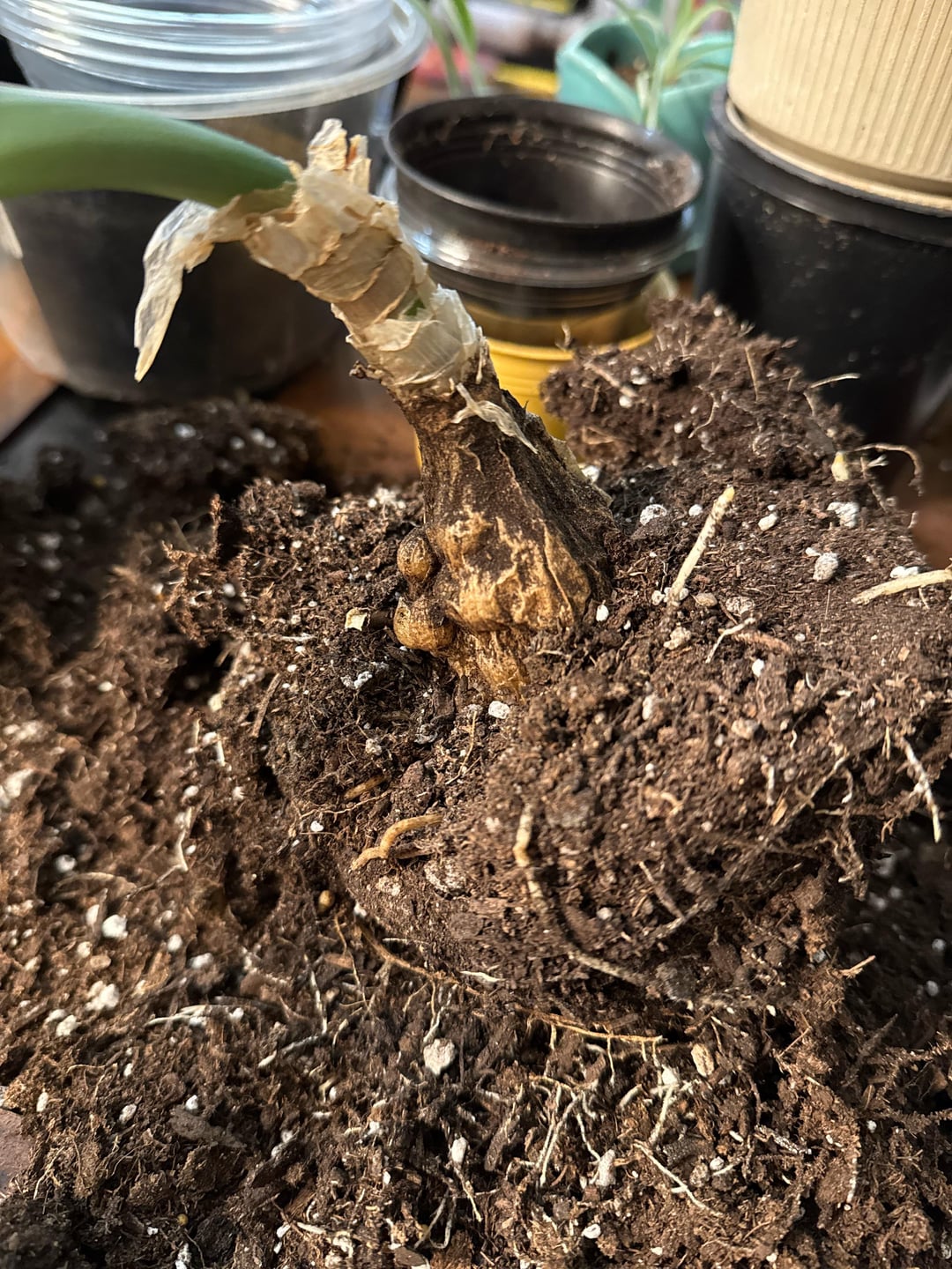 Is that pregnant onion? The leaves look like it and it has bumps on the bulb which I think are babies that have not opened or whatever the word for it. The pregnant onion has baby onions that exact way. If you do figure out it’s a pregnant onion I would love a baby onion. I had one in college and have never seen one since then. I don’t think they are edible.