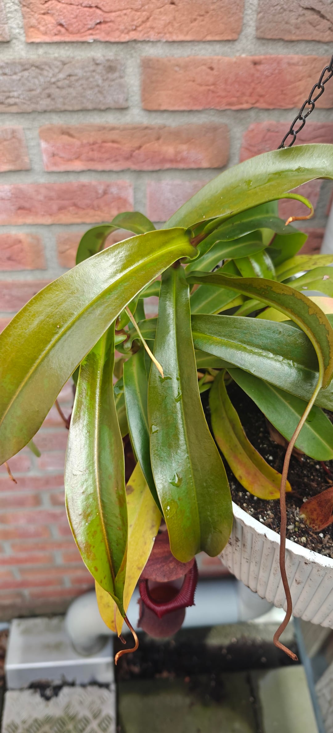 I moved my two nepenthes outside last Tuesday as Spring is finally upon us after they've been living under a grow light through autumn and winter. But just now I noticed that some leaves seem to have some marks now? I find it hard to explain but they look a bit off. Did I move them outside too soon or are the upper leaves simply not used to the outside weather and rain?