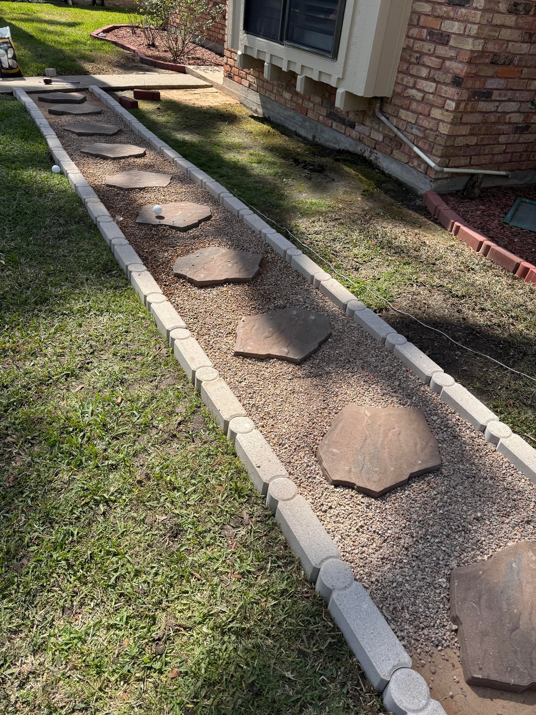 I wanted to keep it as cheap as possible mostly because I’m broke and secondly because our home is on the market and didn’t want to drop a ton of money on something that doesn’t really add any extra value other than a better first impression. I included a before photo but basically what I did was remove the old stones first. Then kind of went back and cut out the grass and formed the walking path. I put a layer of landscaping fabric down to help with weeds,a layer of leveling sand, I then measured and placed the stepping stones out before pouring in the pea gravel to fill in the rest. I didn’t exactly level the sand I laid down but I did use a tamp to get it packed in as good as I could. Also at both ends of the walkway I’m worried I’m going to lose a lot of the pea gravel and send when it rains or just from normal foot traffic.