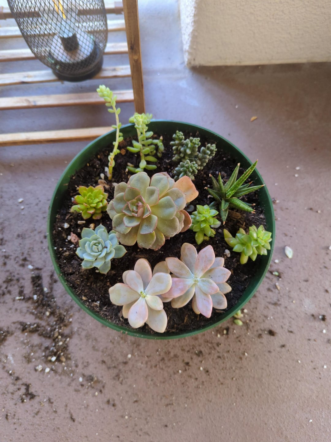 I'm a year into growing succulents. it's definitely been a learn as you go experience. I recently made a community pot per my gf's request. What do you think? Also one of my succulents just exploded in growth. it's got like 4 pups and I don't know whether to leave them on or take them off.
