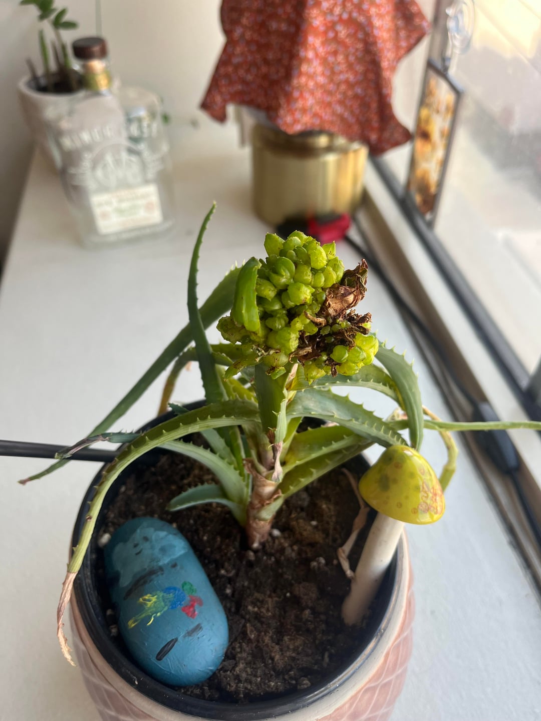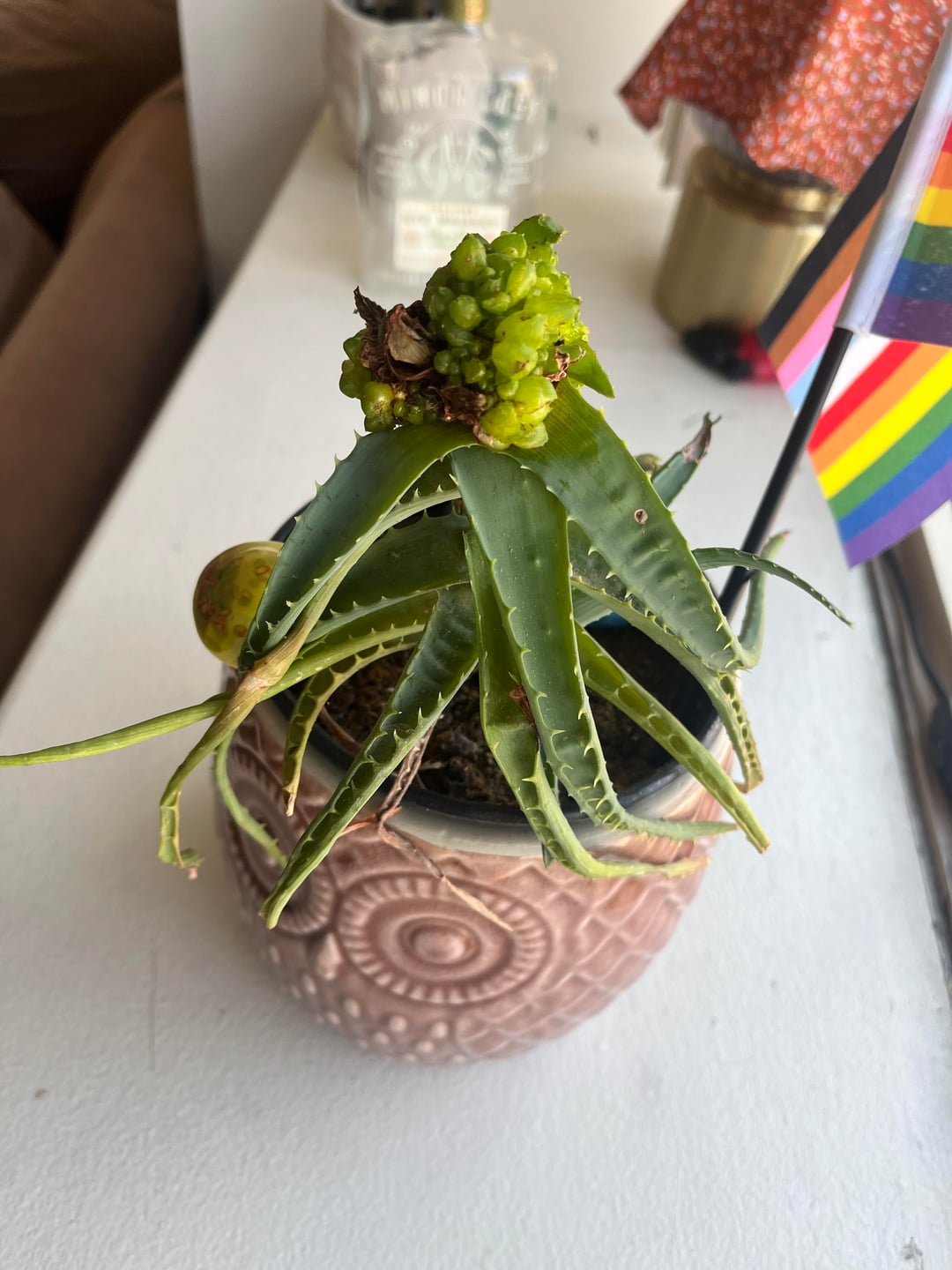 The succulent has been doing alright, but started developing this growth a few months ago. Whatever it is, it has not been stopping the plants growth as the aloe has shot up a successful pup. Does anyone have a diagnosis for what this is? The plant got indirect to low light for 12 months and has since gotten more of a mix of indirect and direct. The plant has also gotten a consistent water regiment of about every 4-5 weeks.