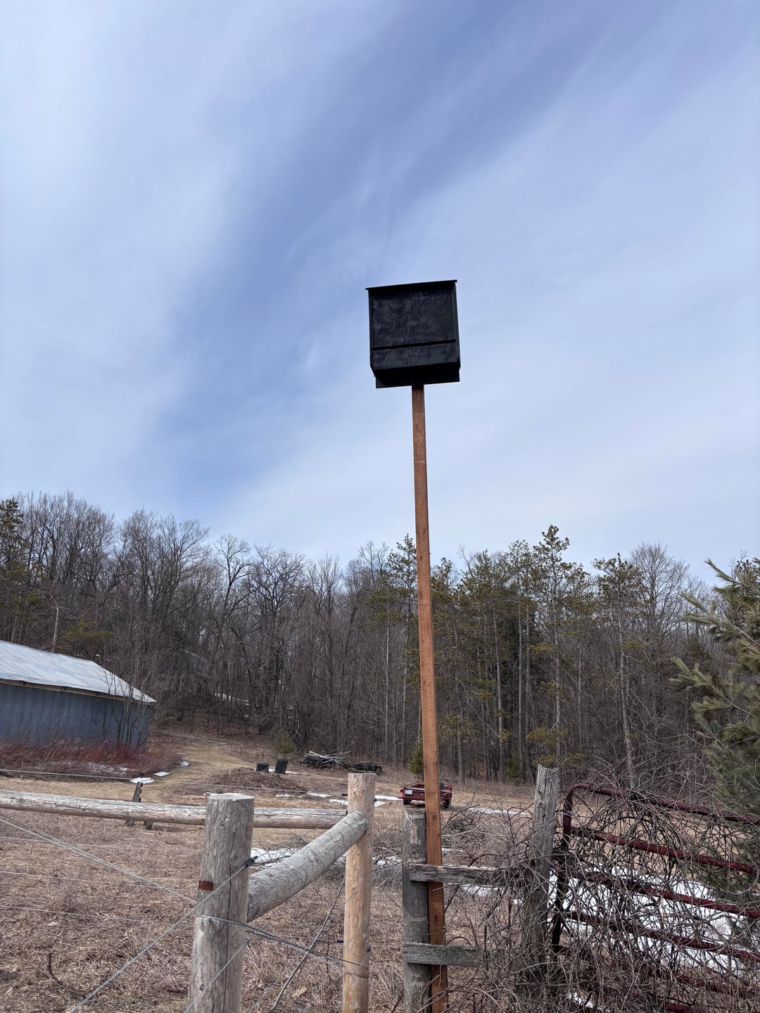 Fiancé and I built and raised a bat box today. Fun project. Though I think I used half my tools getting the post up and sistered to an unused fence post.