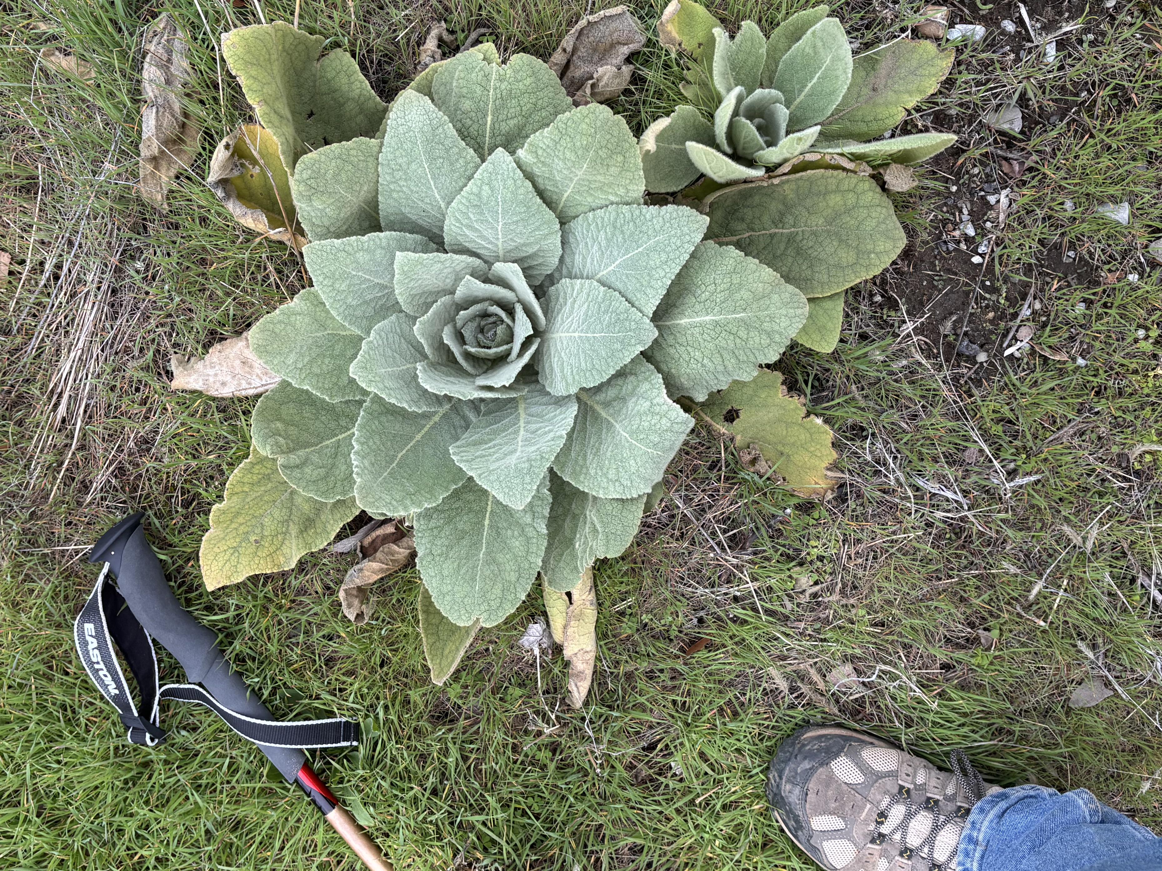 Yes, common Mullein. Huge ones at that! Common mullein is fairly recognizable because it’s leaves typically do not have a petiole (leaf stem), are extremely fuzzy on both top and bottom, get extremely big, grow in a rosette pattern, and have huge flower stalks sometimes reaching over 6 ft with small yellow flowers. It has two main lookalikes, Lambs ear and Foxglove. I can tell you for certain that isn’t lambs ear. Lambs ear is a mint plant meaning it splits into multiple stalks at that stage and has much smaller leaves with a totally different shape. Foxglove is trickier and is also deadly toxic so it’s really important to distinguish. Foxglove have eaves that are mostly or only hairy only on the bottom, typically grow taller, have non-yellow flowers, have very defined sharp ridges on the edge of each leaf, and have a very defined petiole meaning each leaf will look very separated from the stem. What you have is certainly not Foxglove as it is very heavily furred all around, massive, rosette, and lacks a defined petiole. This stuff is very easy to spot if you know the plants well, but if you plan on picking it you have to be able to distinguish foxglove and Mullein on sight. Without a single doubt though that is common Mullein