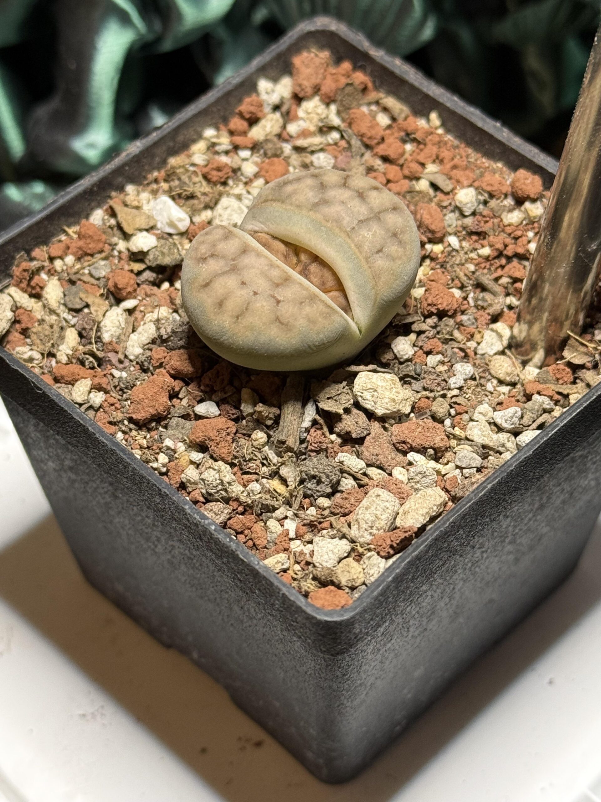 While the plant is splitting, hair-like roots off the plant’s tap root fall apart. At this stage, plant’s new leaves derive their moisture solely from the old leaves. Only commence watering once the splitting has fully finished. Leave the remnants of the withered leaves alone. They provide shade protection for the plant from strong sunlight while emerging into its new growth cycle. Eventually, those dried up leaves will fully shrivel too.
