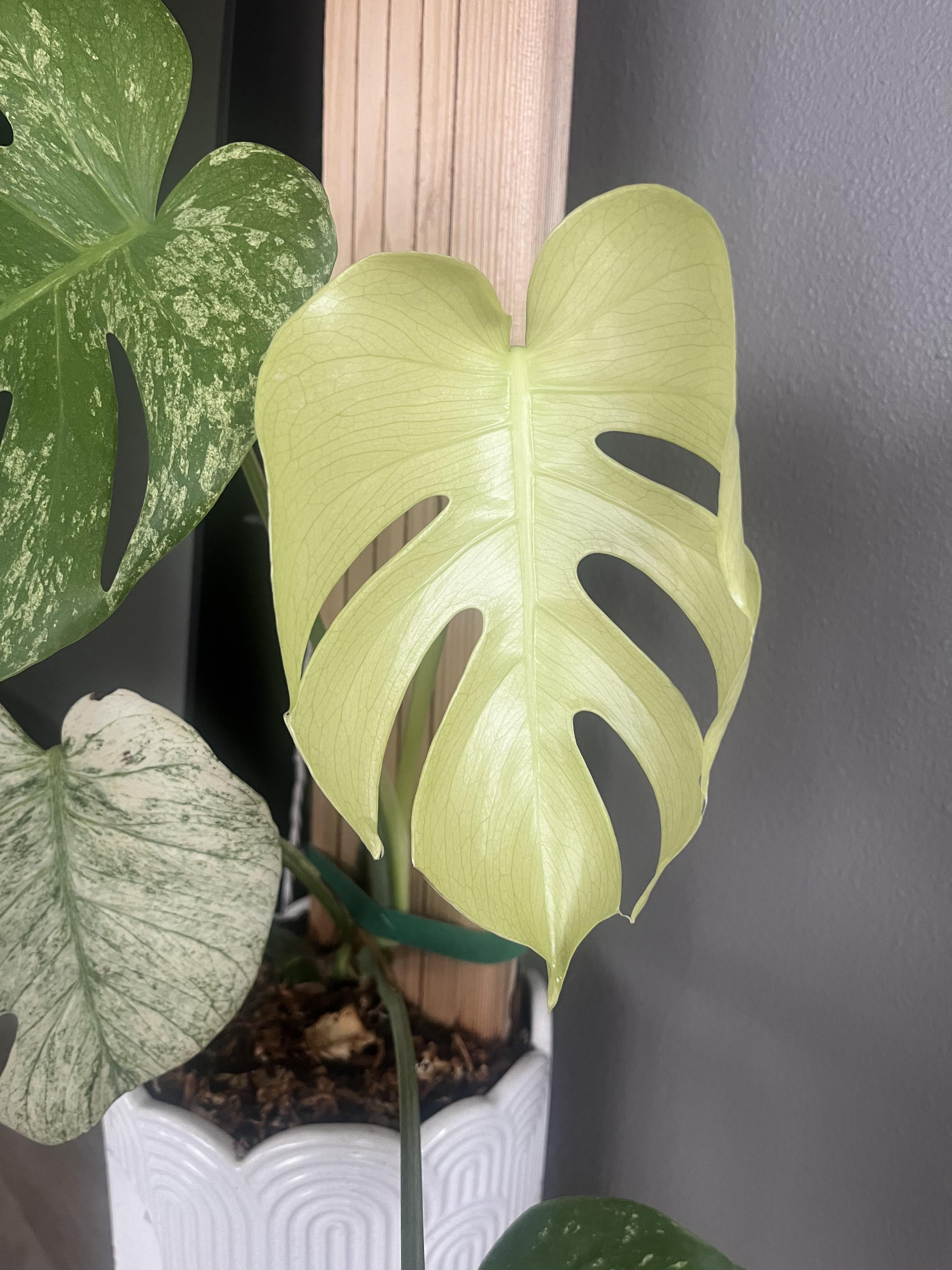 my white monster has her first new leaf of spring, shes sooooo shiny and pale aghhhh i was getting worried since she hadnt grown anything new since october, glad shes doing so well by angelstbeatrixxx monstera 1 Comment tinybluebutterfly 2 days ago Congratulations!
