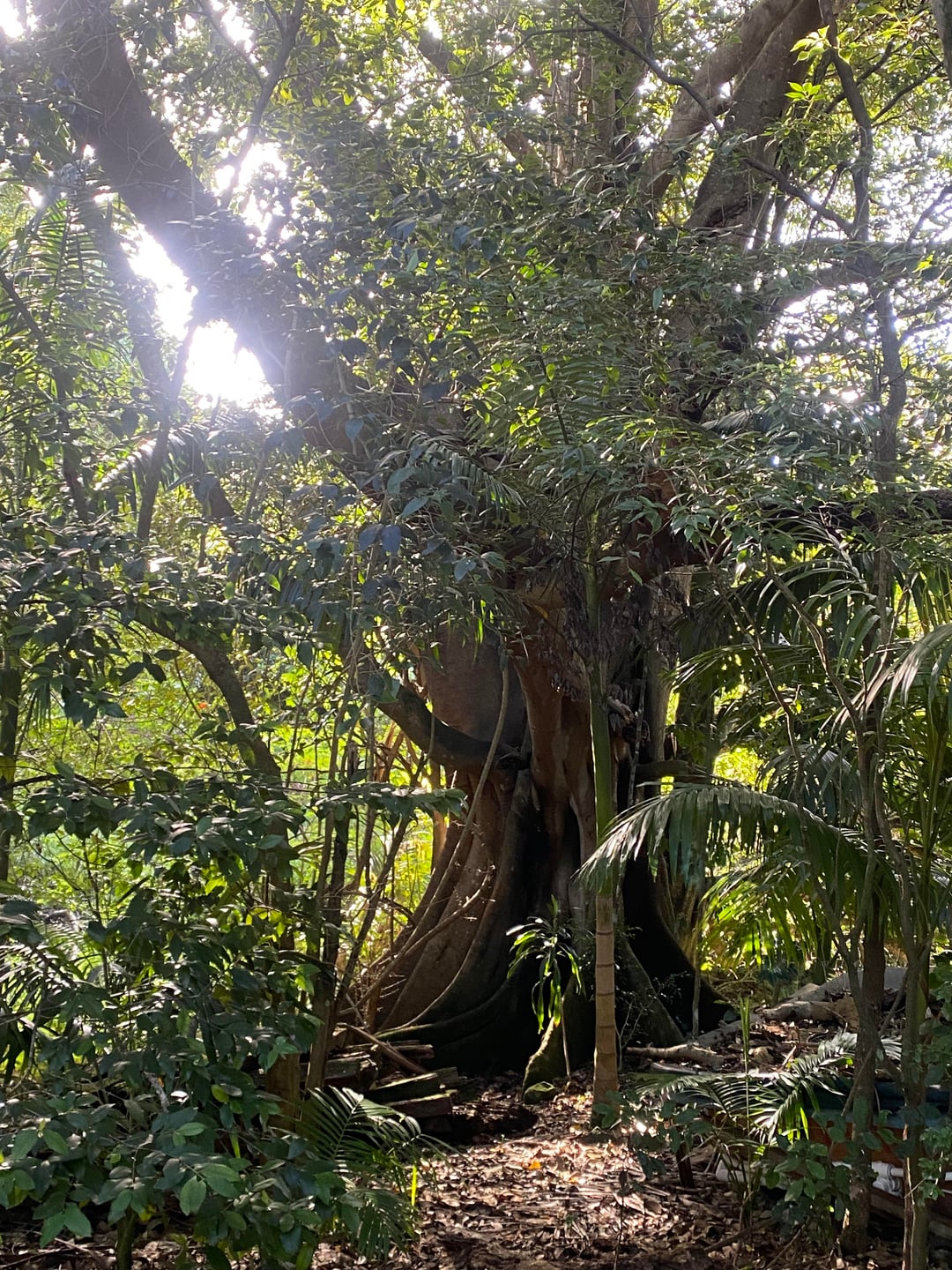 It’s a banyan fig. No, age cannot be estimated from pictures. For one thing, it may have been more than one tree originally. And there is open water behind it, so growth rate may be exceptionally high. But I have spent a lot of time around banyans in forests where ages of other trees could be estimated. Maybe 50 years? 100 at the outside? It’s not ancient.