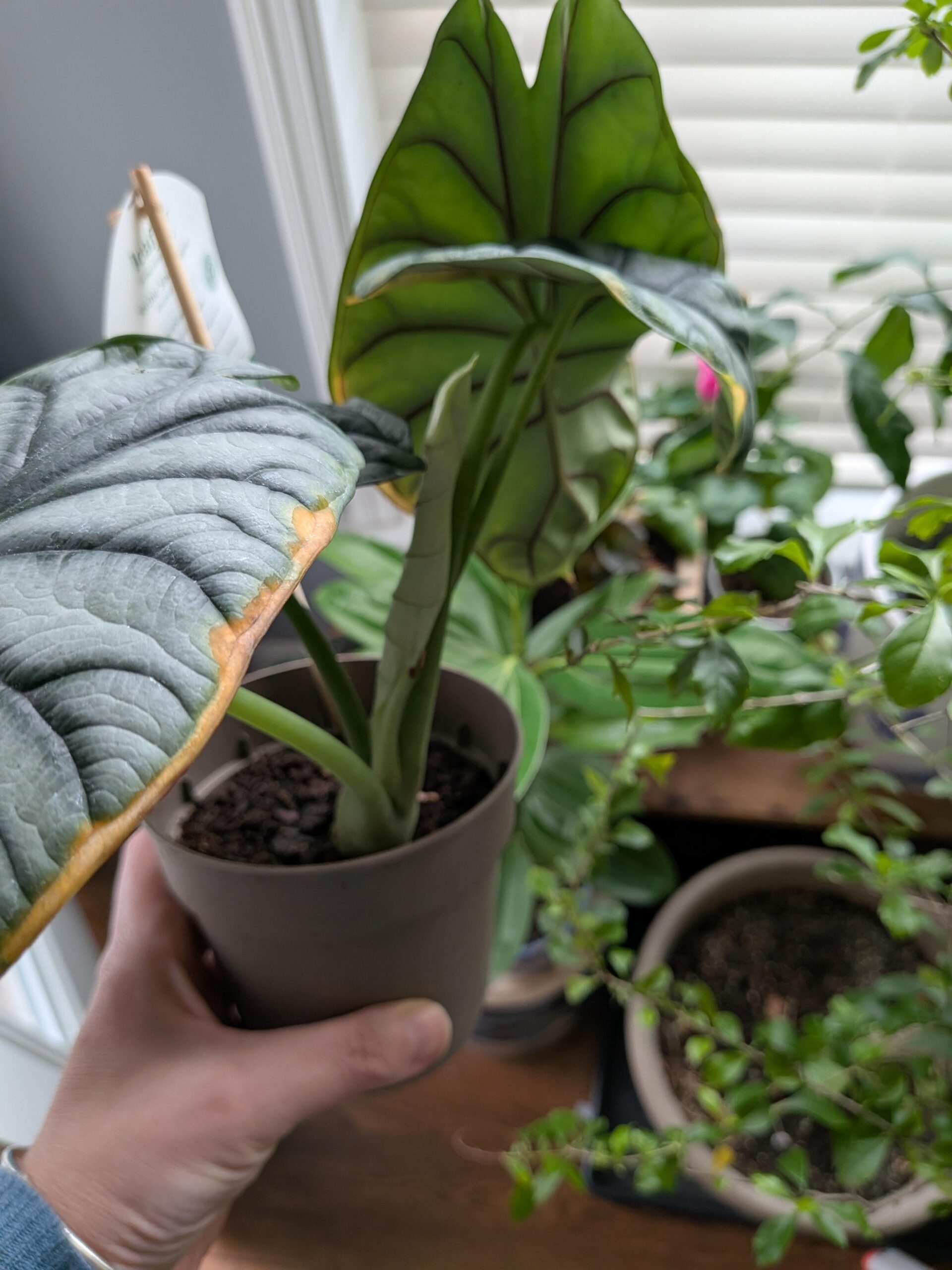 I just got this little one 2 weeks ago. it's pushing a new leaf since I've had it, but I'm worried about the crusty leaf edge. it has been there since I got it. is there anything I need to do?