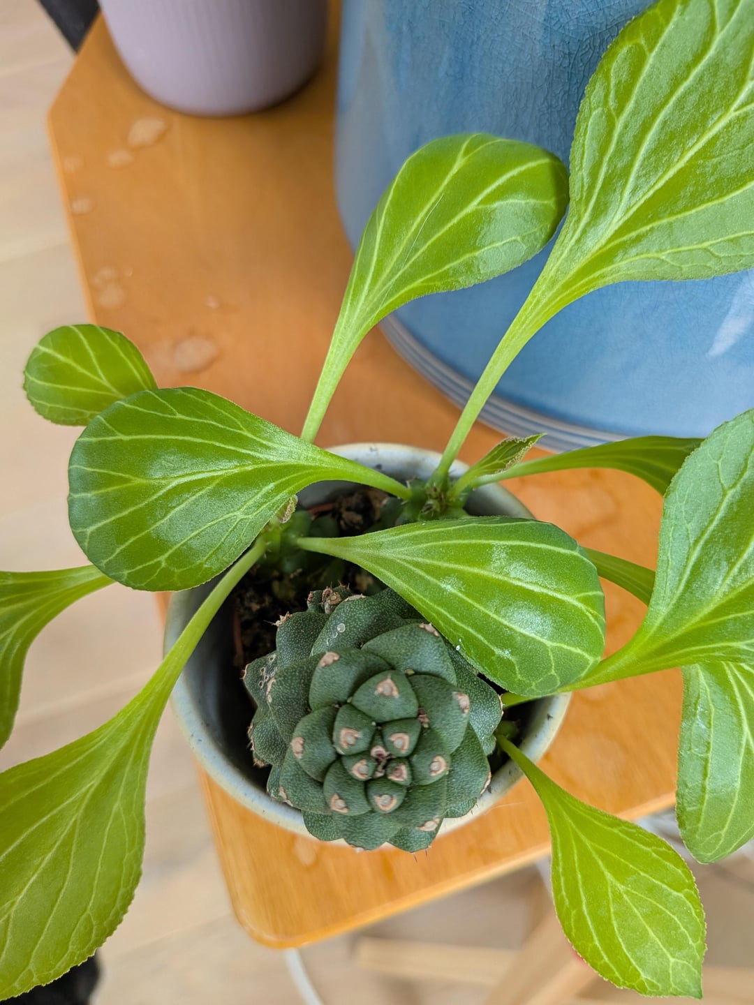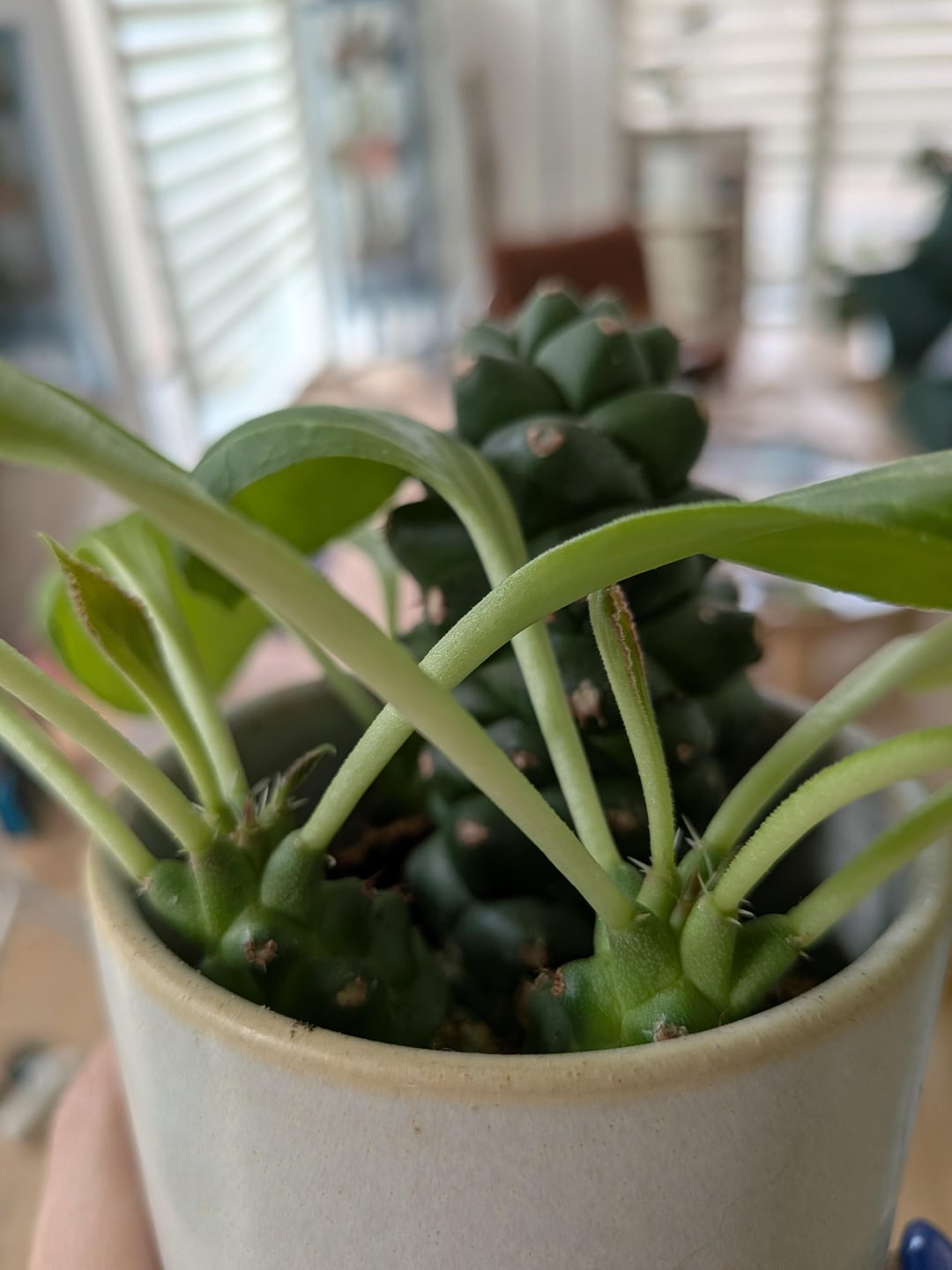 This cactus has looked more or less completely the same for three years until all of the sudden it started putting out leaves. Three of the smaller cactus 'shoots' (bodies? babies?), have leaves growing out of them. Has my plant been taken over by another? What is happening?
