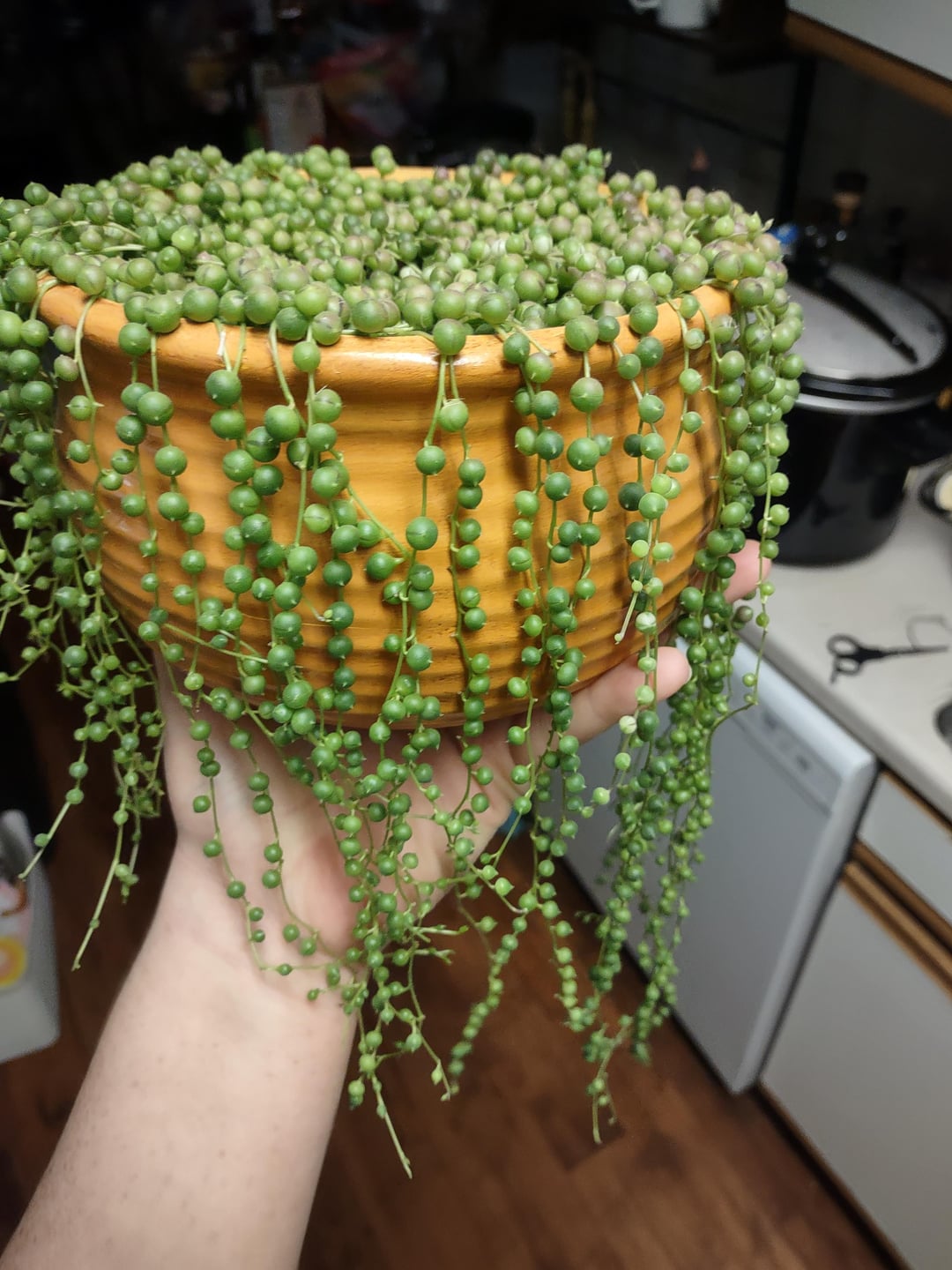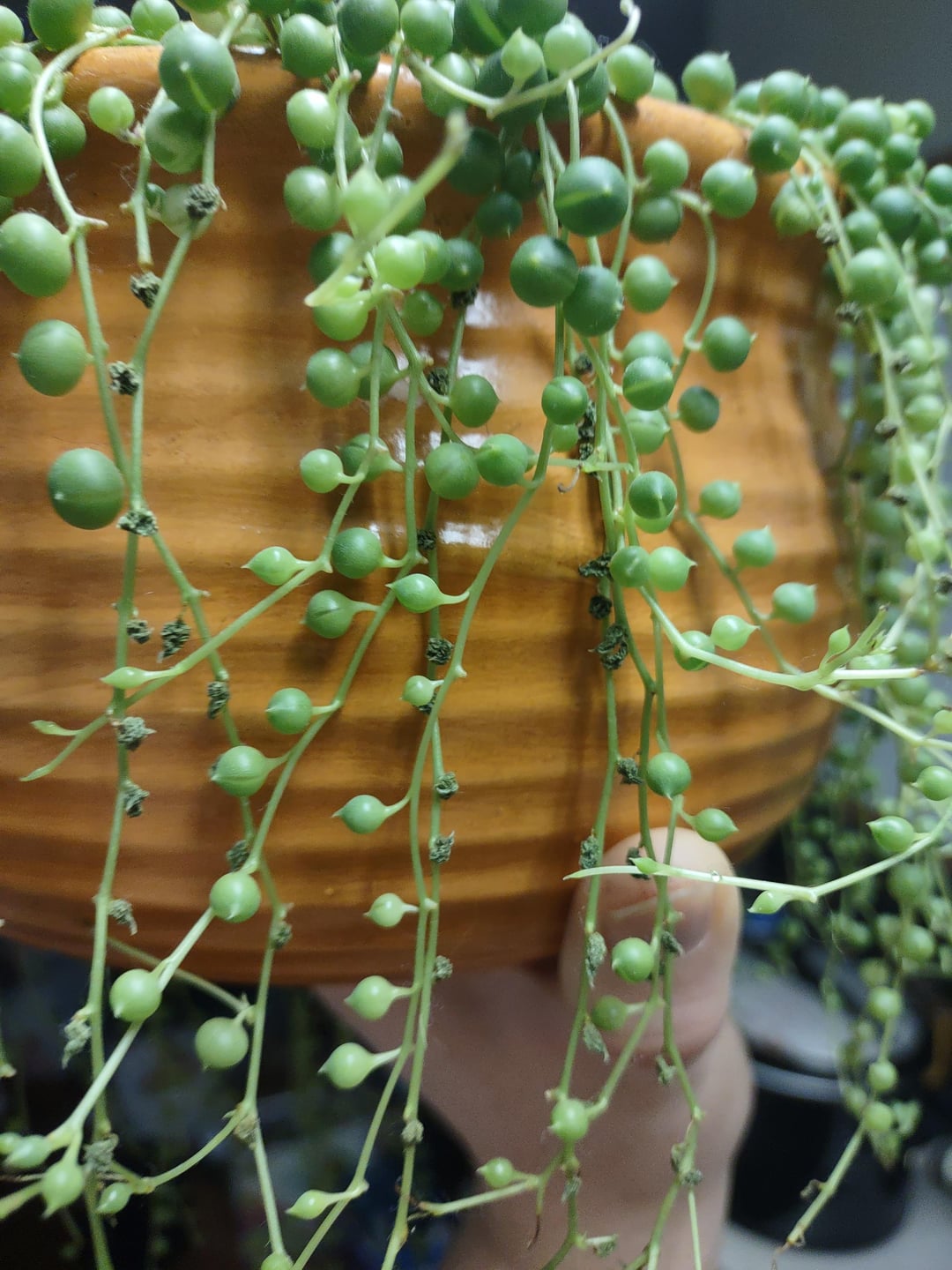 Almost at a year of growth. Noticed some Pearls got a little bit dried out, specifically on the side of the planter not directly getting light from the lamp. Decided to give her a bit of a detangle and trim, (I feel like no one talks about how grippy their strands are lol) as well as rotate the whole pot around. she's so pretty 🥰.
