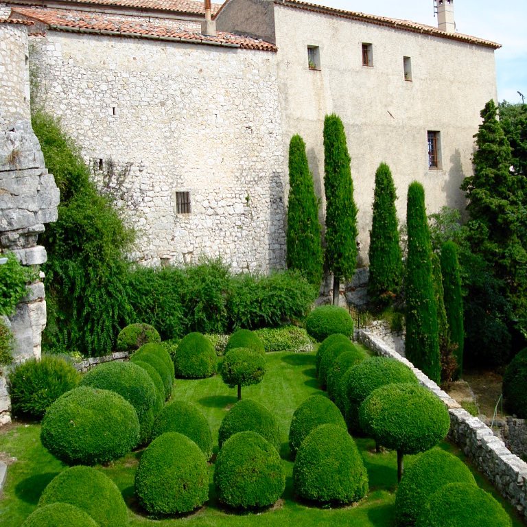 The Italian Terrace at the Chateau de Gourdon, built on rock in the 12th Century, 750m altitude, and overlooking the valley of the Loup #ancientlandscapedesign #clippedforms #topiary #landscapedesign #jamesleedesign
