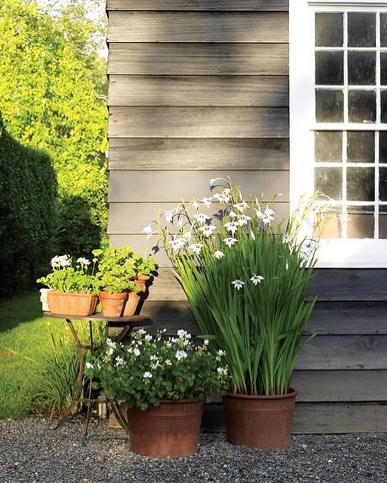 Something bright to start your week: Terra cotta pots filled with white blooming plants and flowering bulbs, such as Gladiolus callianthus ‘Murielae’ (far right), are staged on a vintage metal table. Design by Deborah Needleman. Photo by @minh_ngoc