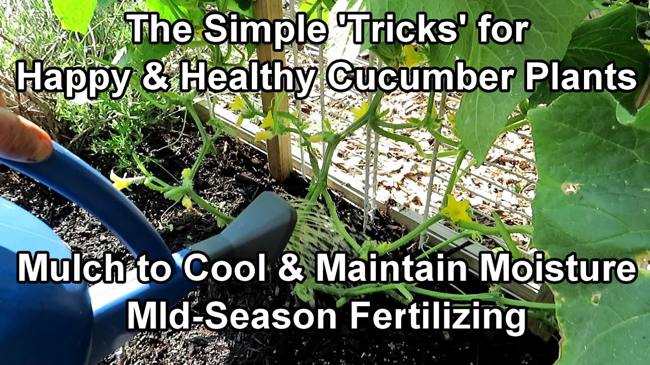 Mulching conserves soil moisture and keep the surface roots of cucumbers cool. A mid-season side dressing of slow release organic fertilizer and fast release water soluble fertilizer keeps cucumber plants happy and producing. This is how I do it.