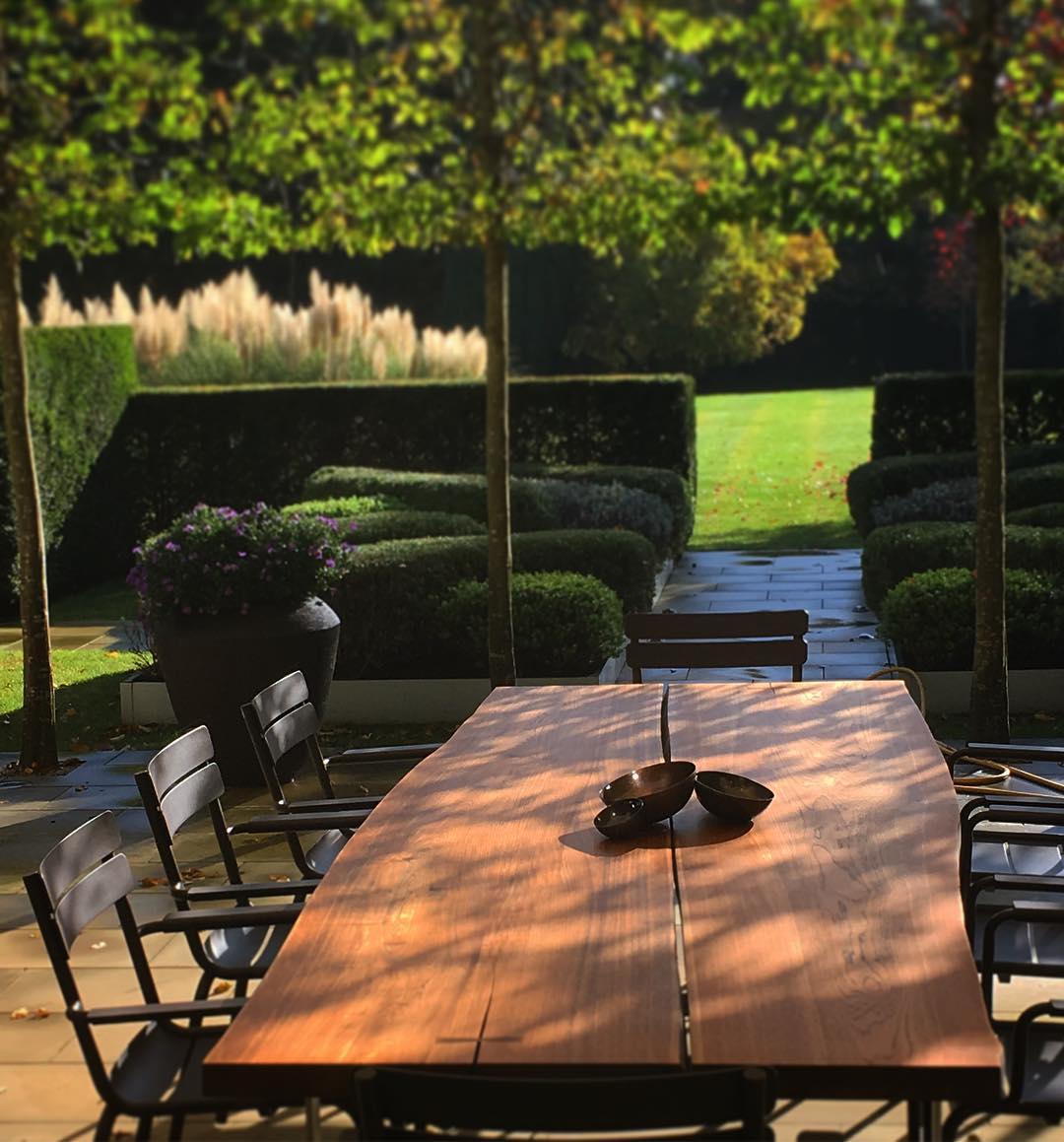 The dinning terrace area of a RMGD garden in Surrey earlier this week looking so inviting. The table was a special commission using two pieces of 50 year teak boards beautifully crafted by Jeremy Pitts. @jeremypitts.co.uk #garden #gardens #landsacape #landscapedesign #gardendesign #teak #table #terrace #flowerslovers #flowers #picoftheday #pampasgrass #hedge #trees #sun #autumn #shadows #style #elegant #sophisticated