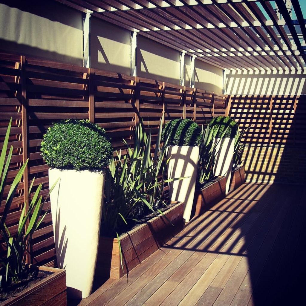 On this contemporary roof terrace in Islington, London, we used Iroko wooden slats to the side and above and sail cloth panels to screen the neighbouring properties and provide a private oasis in the centre of the busy city. #rooftop #terrace #screening #london #buxus #box #boxwood #summer thank you @gardenista_sourcebook